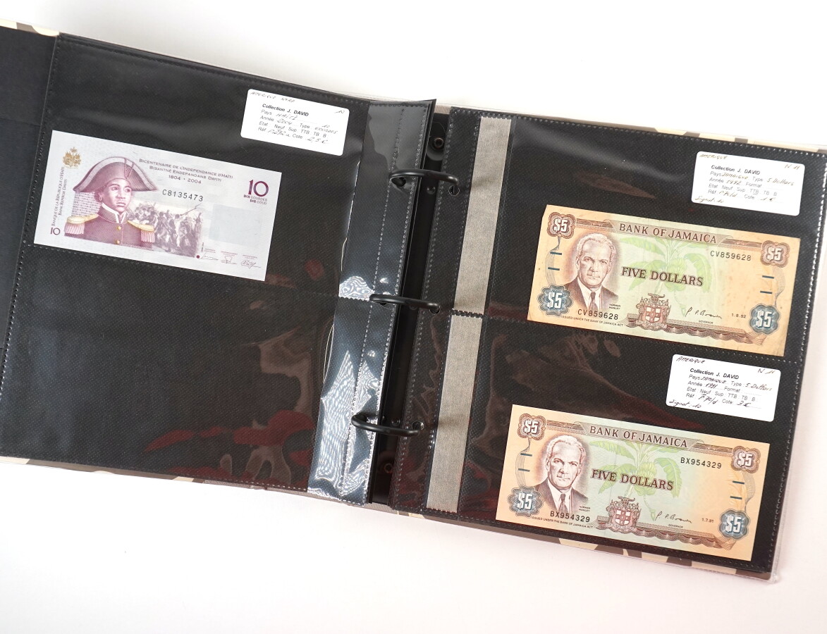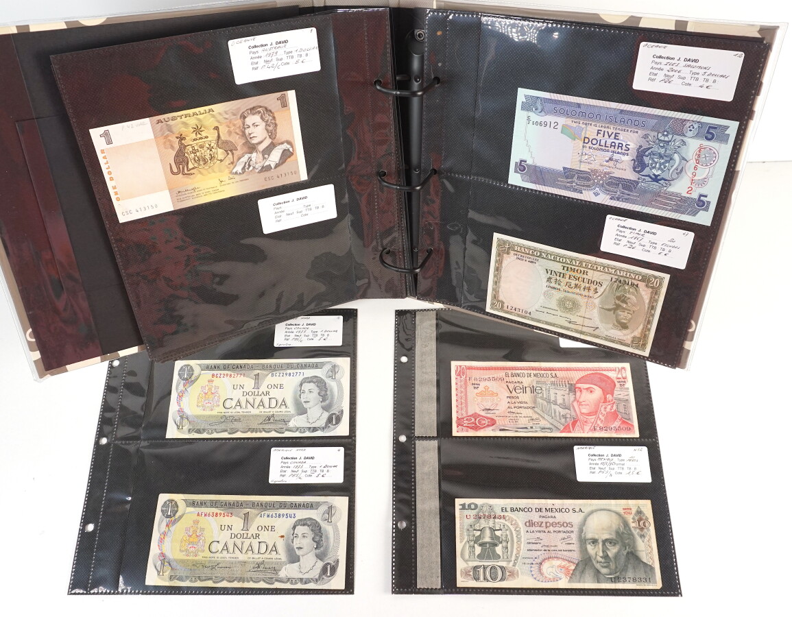 MONDE : Classeur de 30 billets étrangers comprenant : Canada, Cuba, Haïti, Jamaïque, Mexique, Australie, Iles Salomon, dont 25 Centavos Chihuahua 1913 et 1 Peso Chihuahua 1915, et divers.