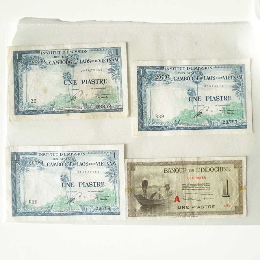- INSTITUT D'EMISSION DES ETATS DU CAMBODGE DU LAOS ET DU VIETNAM : 5 x 1 Piastre, TB; 5 x 1 Piastre émission du Vietnam, TB à TTB.