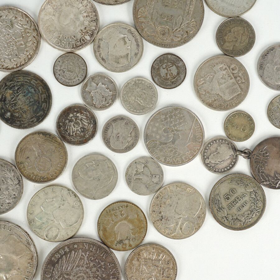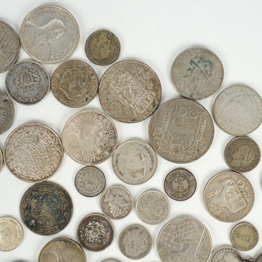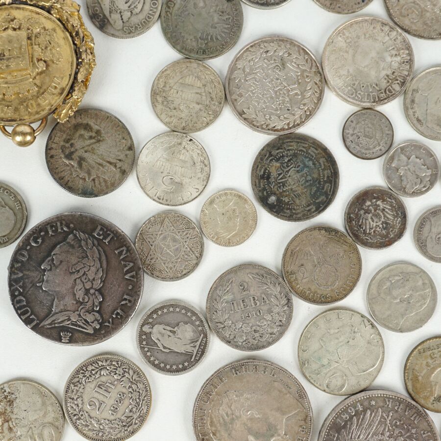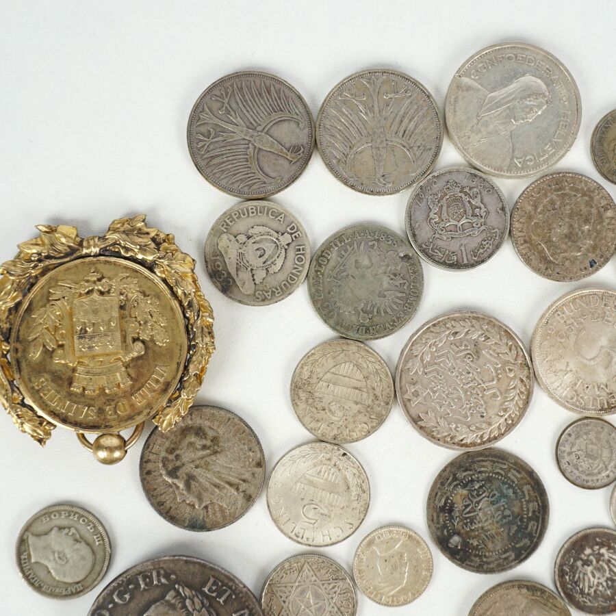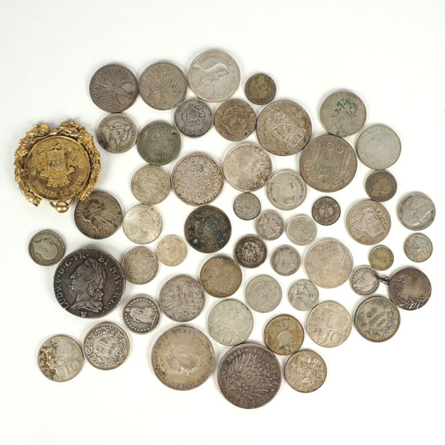 MONDE : Ensemble de 53 monnaies en argent de différents titres dont : Ecu Louis XV vieille tête 1772 I (montée), Egypte, Allemagne, Bulgarie, Belgique, Autriche, Pologne, Liban, Maroc, Suisse, Pays-Bas, médaillette religieuse, médaille Ville de Saintes, etc. Poids brut : 430 g environ.