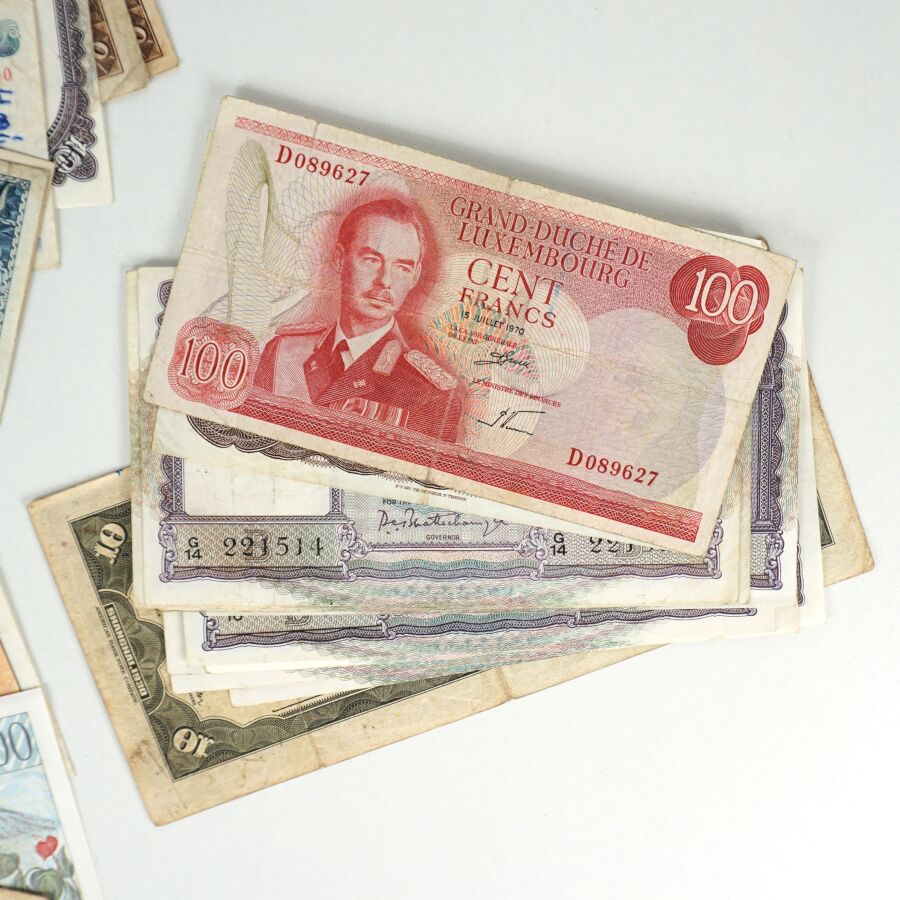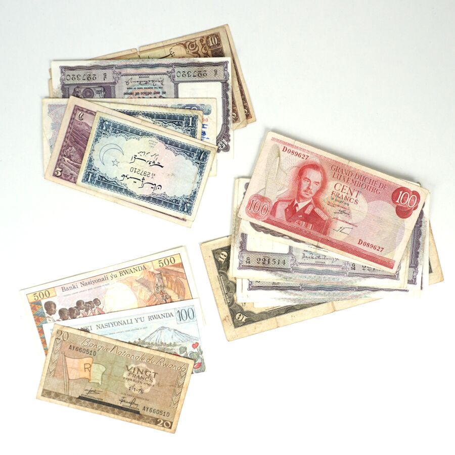 MONDE : Lot de 26 Billets dont Inde, Pakistan, Luxembourg, Espagne, Chine, Rwanda, Grèce, etc.