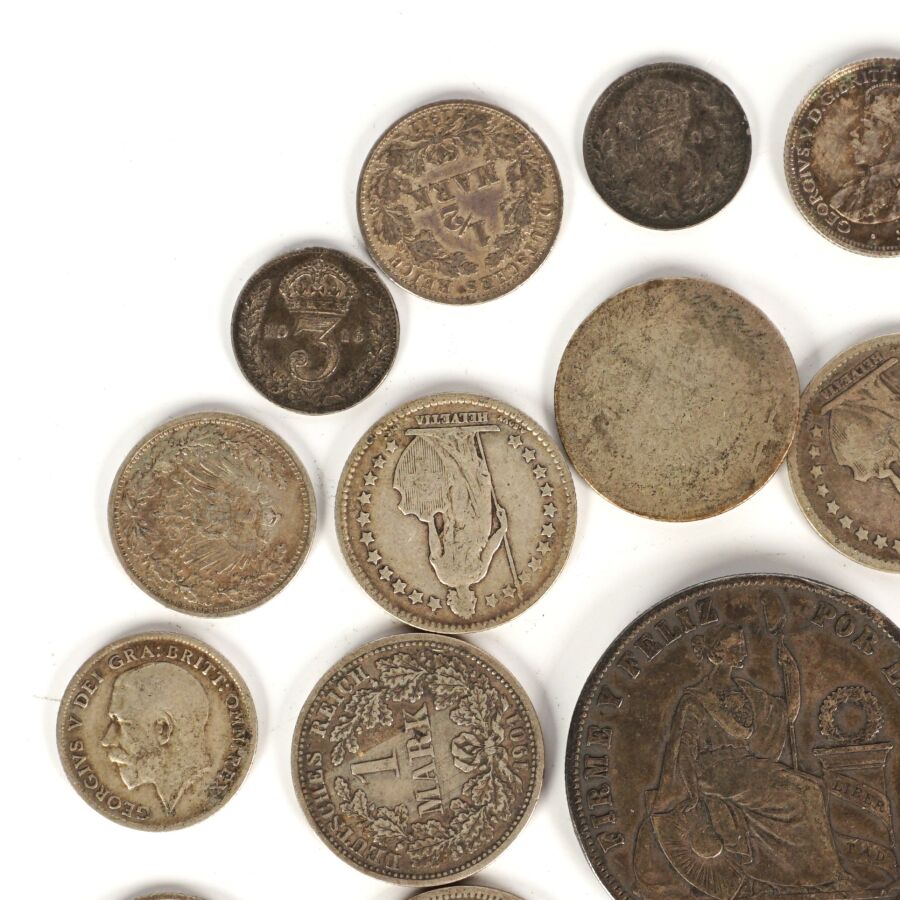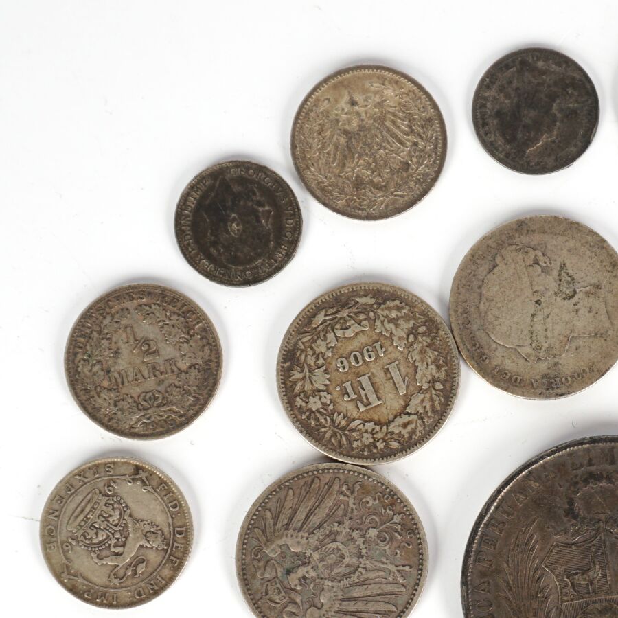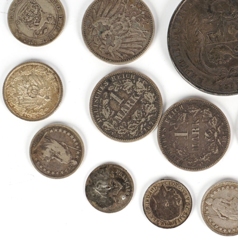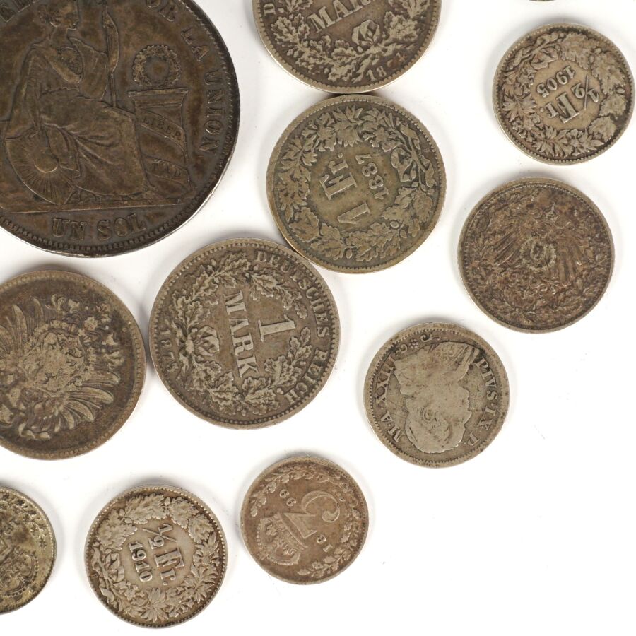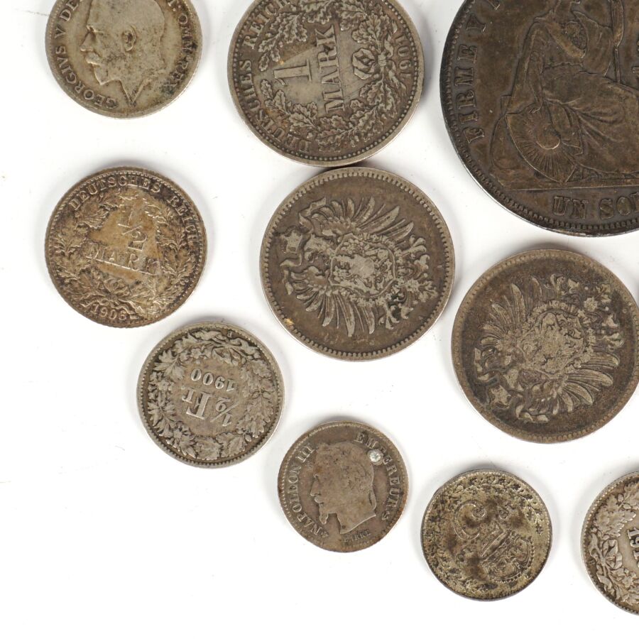 MONDE : Lot de monnaies en argent de titres différents, 19ème et 20ème siècles, dont : Demi Frc (x4) et 1 Frc Suisse (x3), 1 Sol Perou 1872, Allemagne 1/2 Mark (x4) et 1 Mark (x5), divisionnaires Grande-Bretagne et divers, Poids brut : 110 g environ.