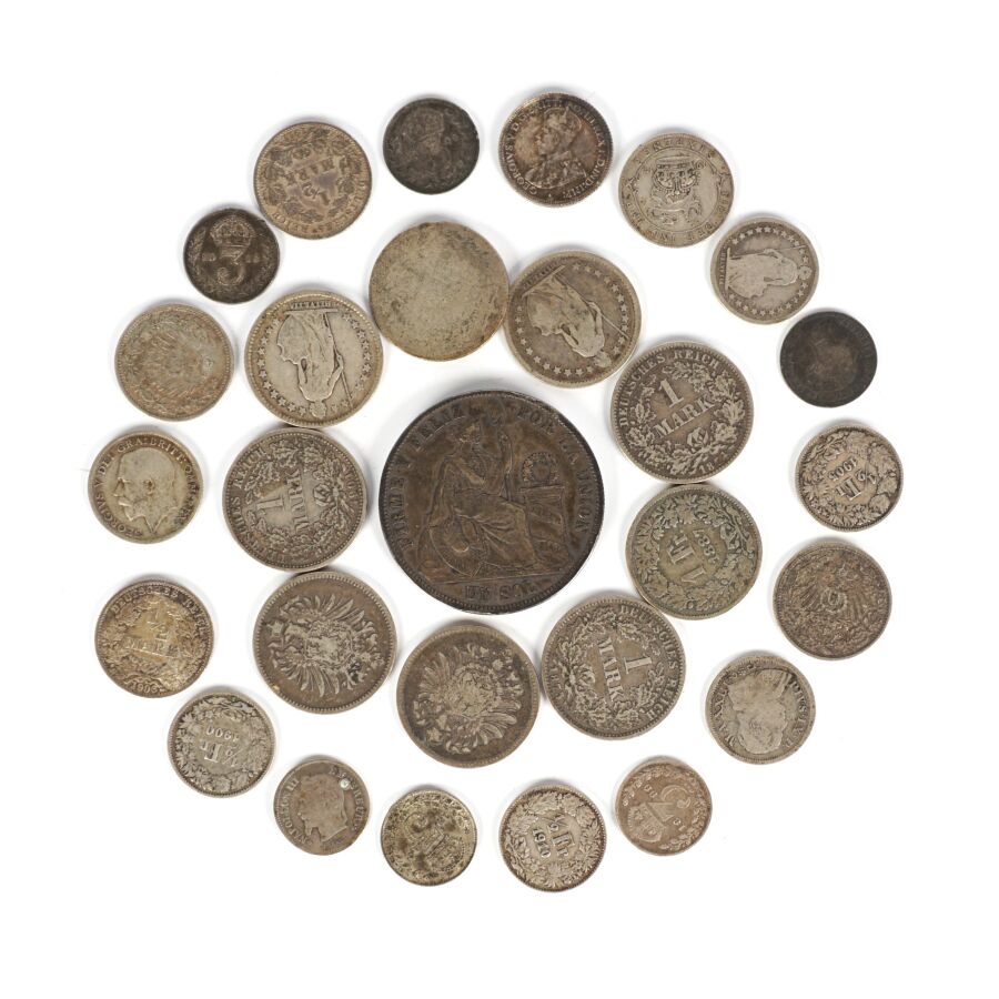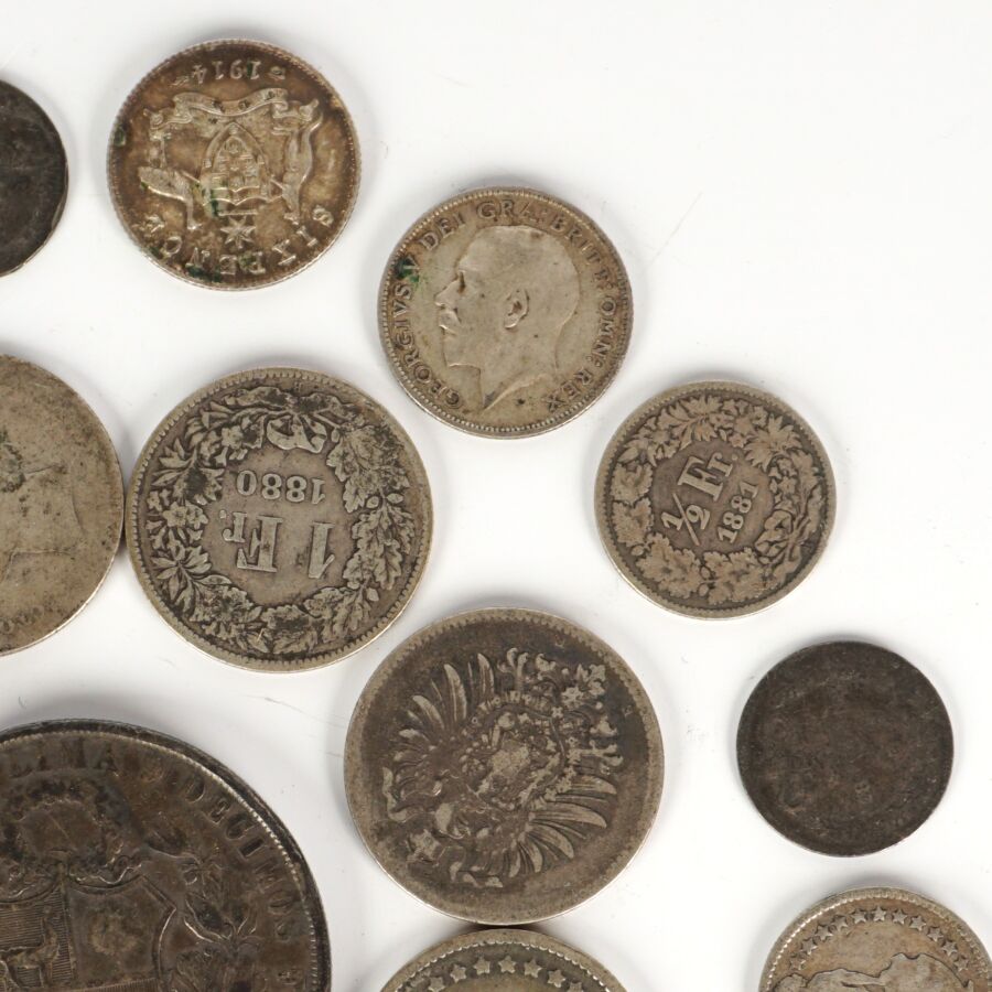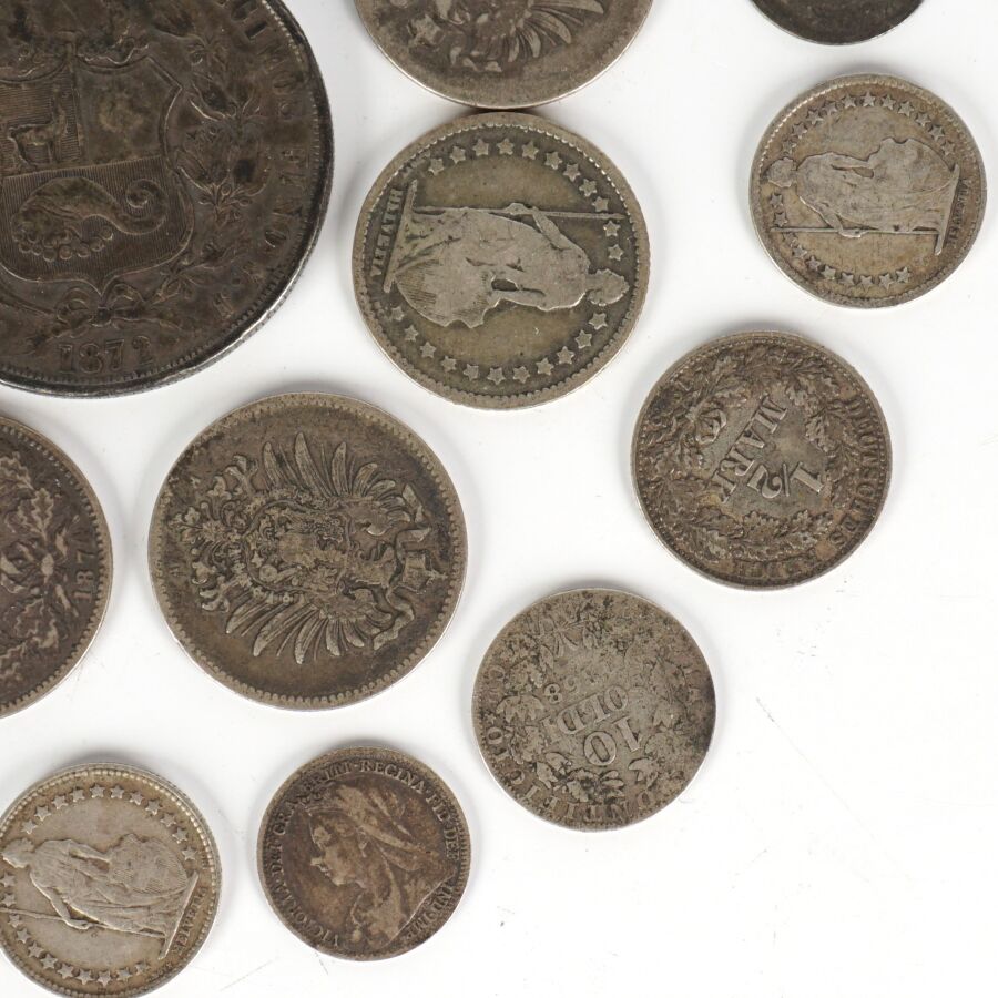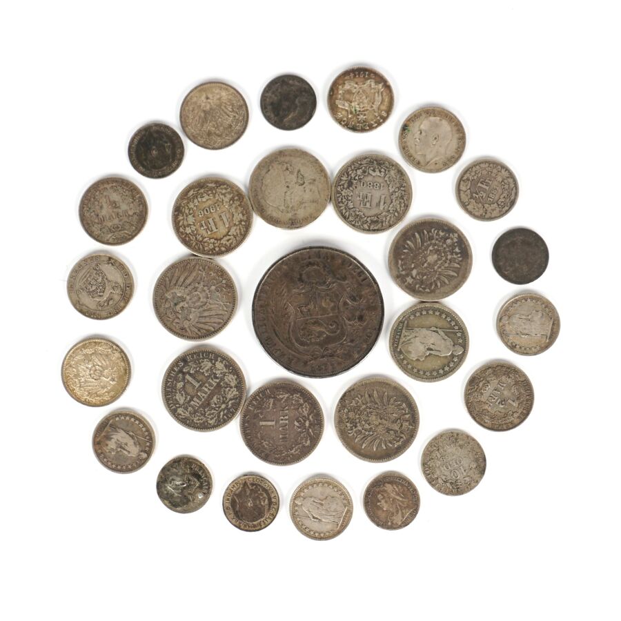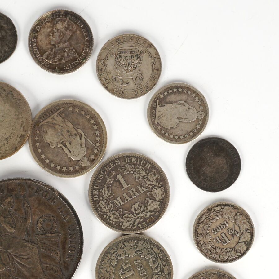 MONDE : Lot de monnaies en argent de titres différents, 19ème et 20ème siècles, dont : Demi Frc (x4) et 1 Frc Suisse (x3), 1 Sol Perou 1872, Allemagne 1/2 Mark (x4) et 1 Mark (x5), divisionnaires Grande-Bretagne et divers, Poids brut : 110 g environ.