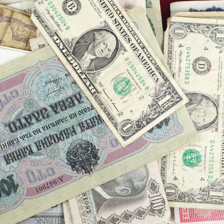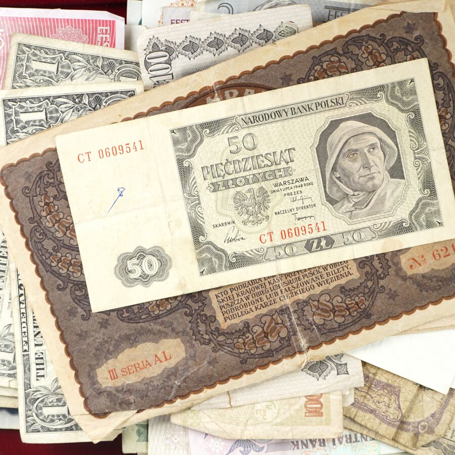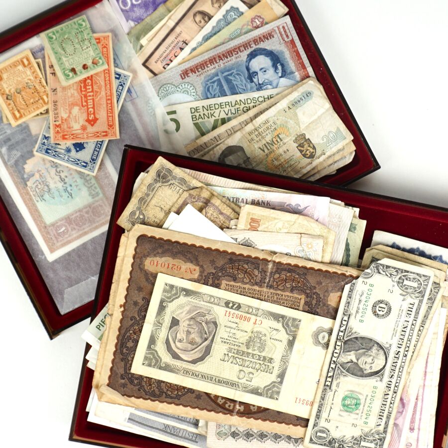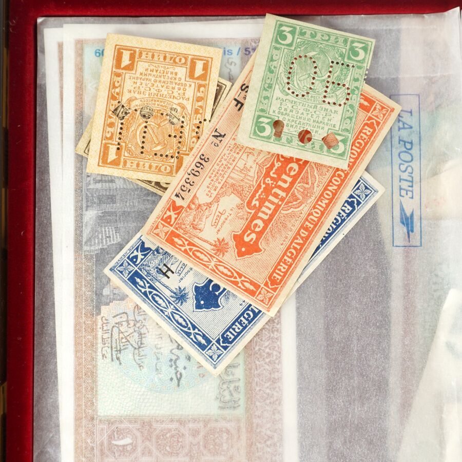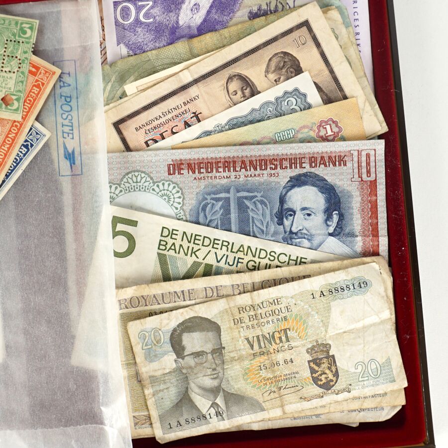 MONDE : Lot d'environ 100 billets dont : Yougoslavie, USA, Qatar, Egypte, Grèce, Israël, Belgique, Portugal, Tchecoslovaquie, Luxembourg, Suède, Pologne, Pays-Bas, Lettonie, Turquie, Bulgarie, 50 Cts et 1 Frc Région économique d'Algérie, URSS.