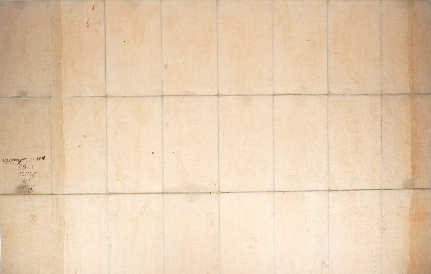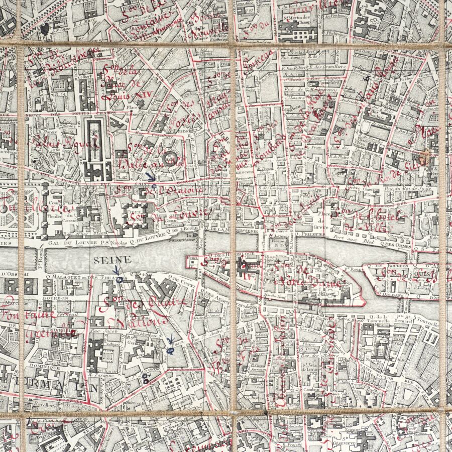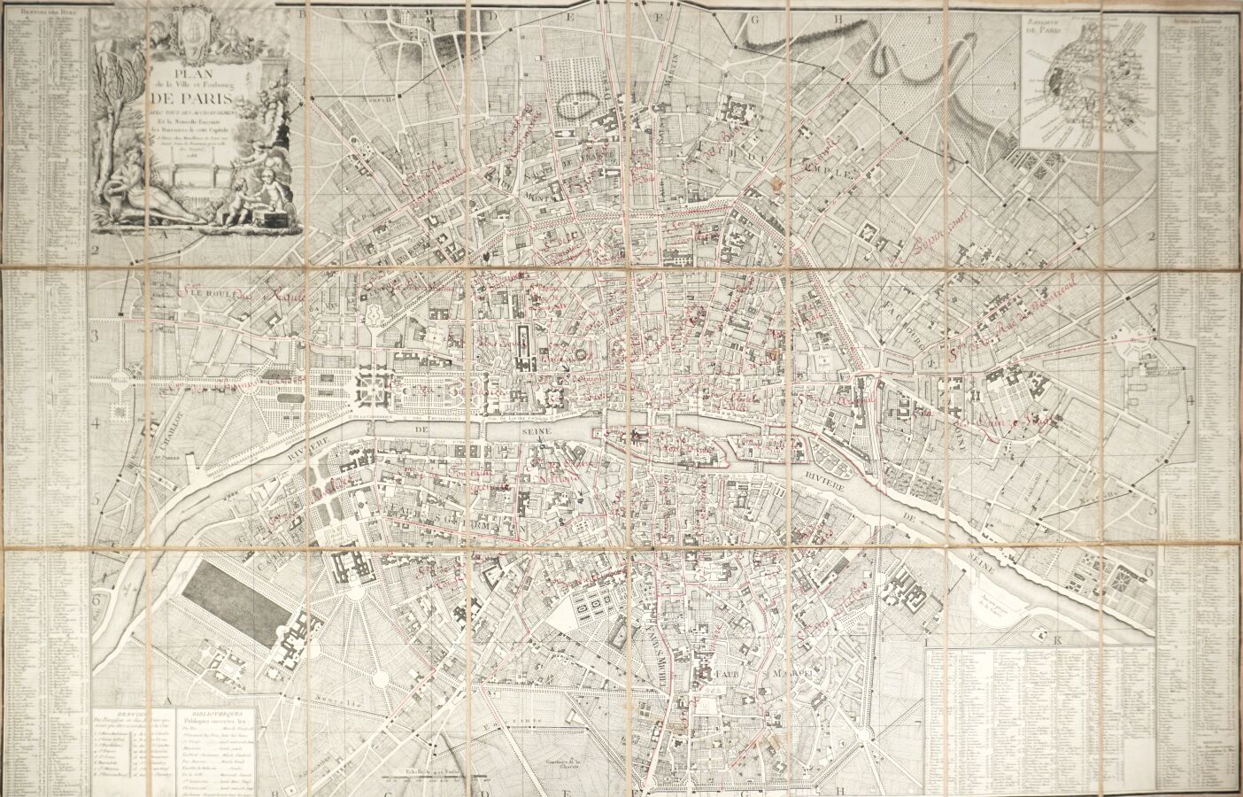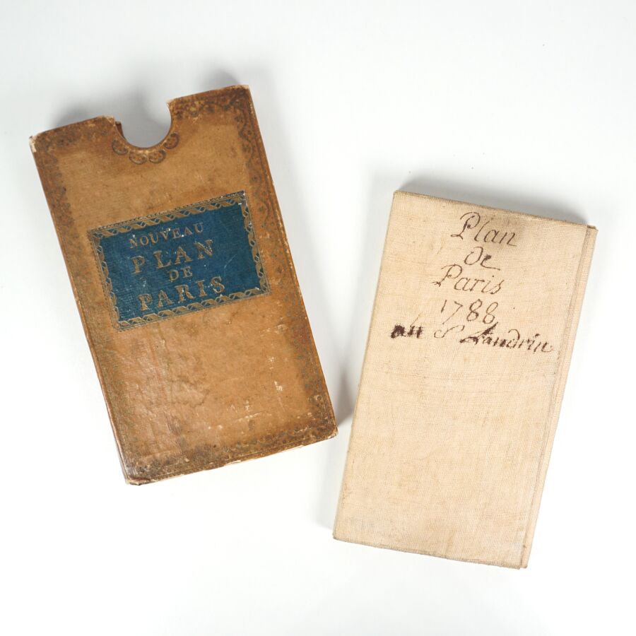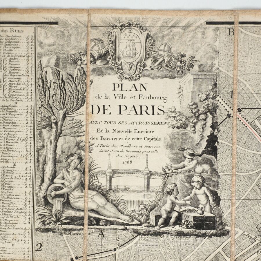 MONDHARE (Louis Joseph). Plan de la ville et faubourgs de Paris avec tous ses accroissements et la nouvelle enceinte des barrières de cette capitale. Paris, Mondhare et Jean, 1788. Plan gravé, entoilé, replié. 64 x 98 cm. Sous étui cartonné de l'époque avec pièce de titre bleue. Contours et indications manuscrites anciennes à l'encre rouge.