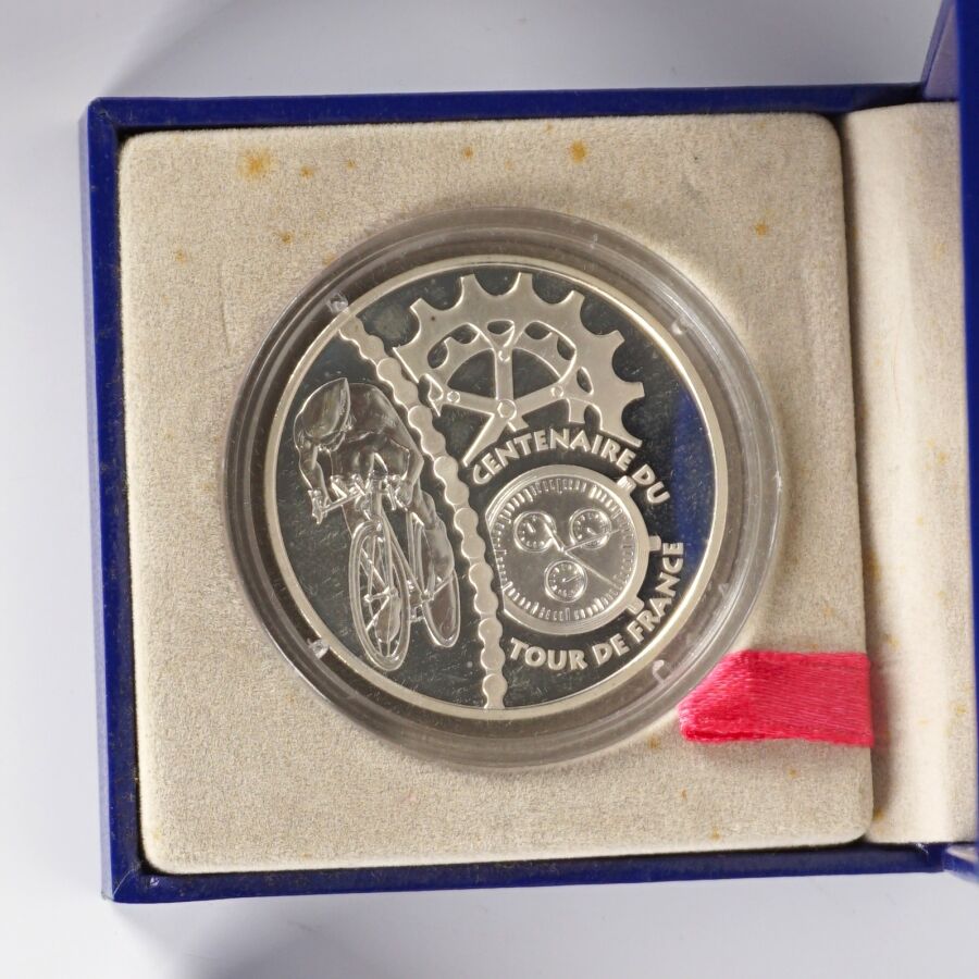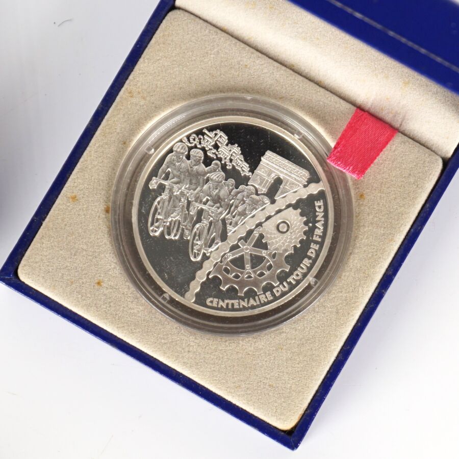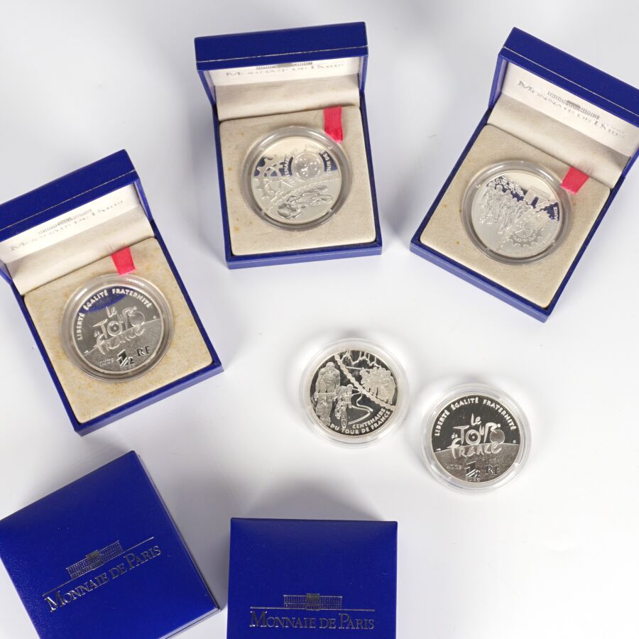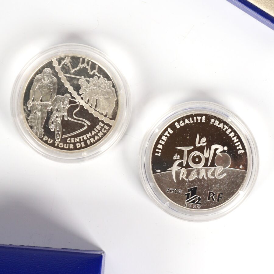 MONNAIE DE PARIS - Centenaire du Tour de France 1903-2003: Lot de 5 x 1 1/2 Euro, Argent (900/°°) 22, 22905 exp en Belle Epreuve, présentés dans leur écrin individuel, Poids brut : 20 g environ chaque.