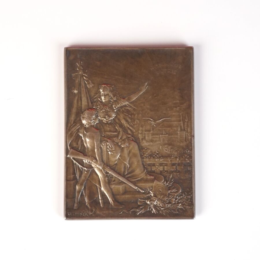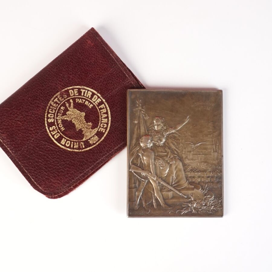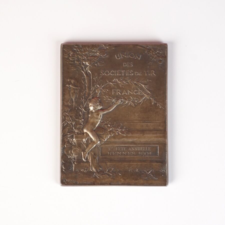 Monnaie de Paris : Médaille plaquette en argent de l'Union des sociétés de tir de France "Rennes 1901" par G. Dupré dans son étui d'origine, 64 x 48 mm, Poids brut : 73 g environ.