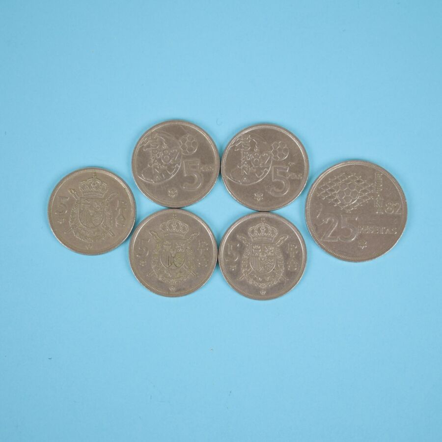 Monnaie espagnole en argent : 3 x 5 Pesetas, 1975 ; 2 x 5 Pesetas, 1982 ; 1 x 25 Pesetas, 1982. Poids brut : 36 g.