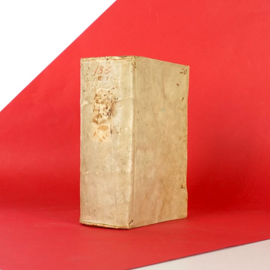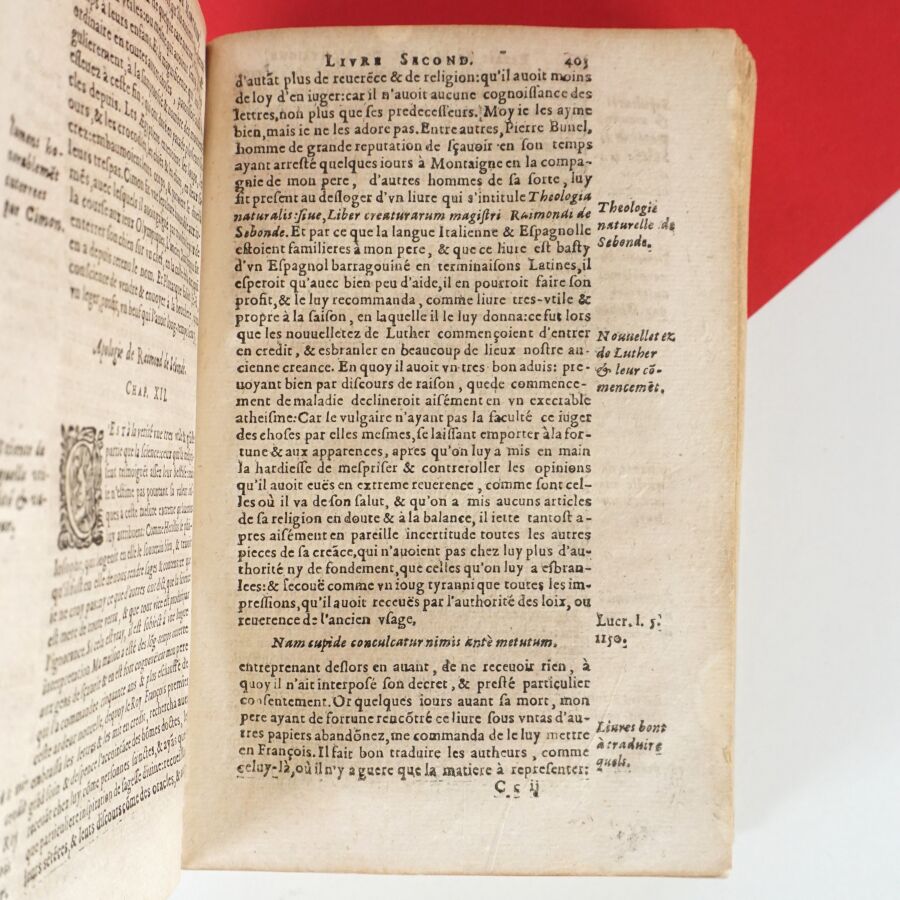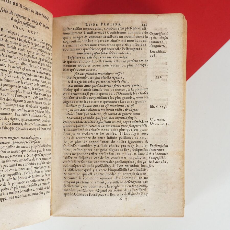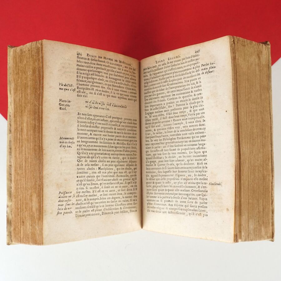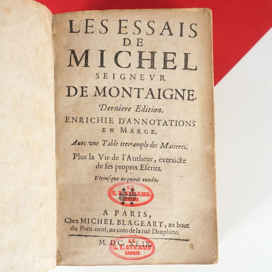 MONTAIGNE (Michel de). Les Essais. Derniere edition enrichie d'annotations en marge. Avec une Table tres-ample des Matieres. Plus la Vie de l'Autheur, extraicte de ses propres Escrits. Paris, Michel Blageart, 1649. Fort in-8, vélin souple ivoire de l'époque, dos lisse avec traces de titre manuscrit (tache au dos). Rare édition des Essais (à laquelle un article a été consacré dans le Bulletin de la Société des Amis de Montaigne, IV, 3 (1965).) Cachets ex-libris à l'encre rouge E. T. Strauss.