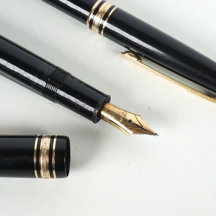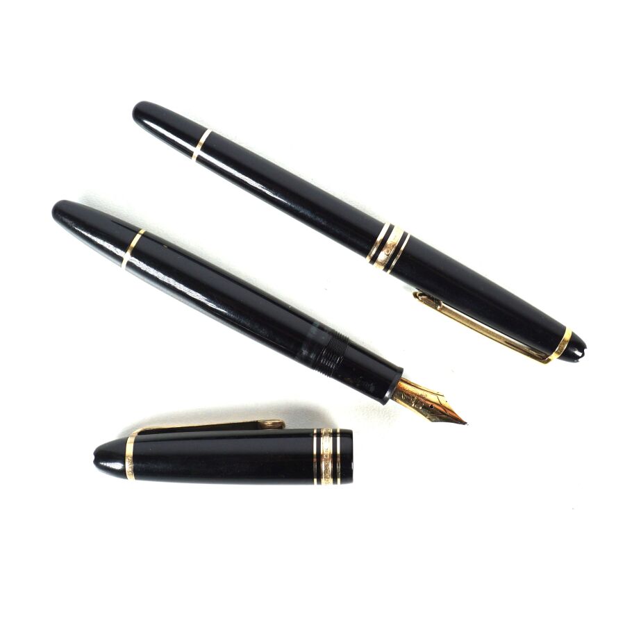 MONTBLANC : Deux stylos, modèle "Meisterstück", laqués noir et métal doré, l'un à bille, le second à plume, la plume en or 18K (750/oo), L. 13.5 et 14 cm.