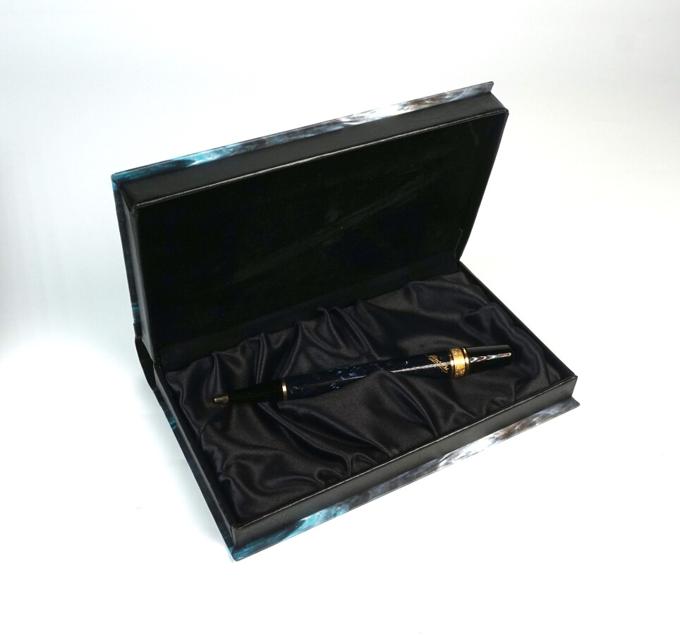 MONTBLANC : Stylo à bille Meisterstück "Edgar Allan Poe", édition limitée de la collection "Ecrivains", le corps en résine marbrée d'un bleu profond, la partie haute ornée d'un motif victorien doré à l'or 18K (750/oo), gravée de la signature dorée de l'écrivain, et numérotée 12859/15000. Modèle créé en 1998.