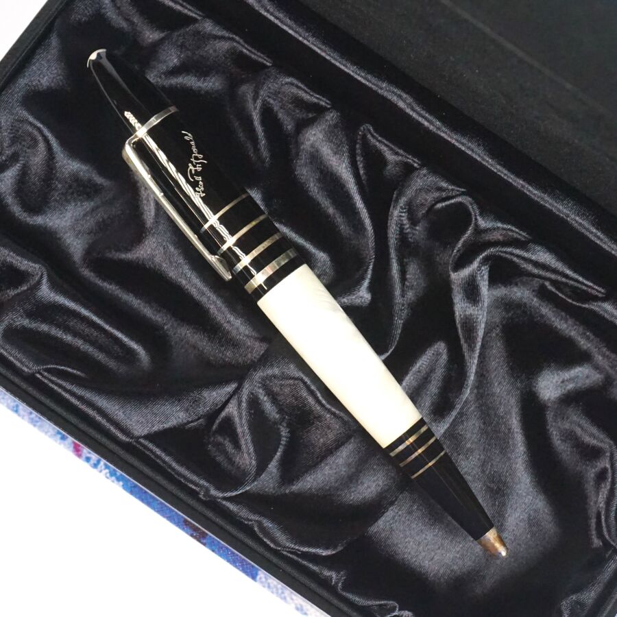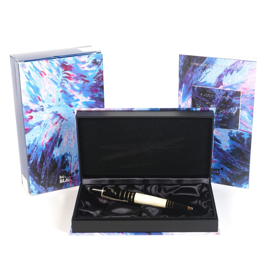 MONTBLANC : Stylo édition limitée "Francis Scott Fitzgerald" de la collection "Ecrivains" 2003, nacré, laqué noir et métal argenté, signé et titré, numéroté 08593/16500 et gravé "Sita Ouest", présenté dans son coffret d'origine à motif d'un livre, avec sa notice et sa surboîte.