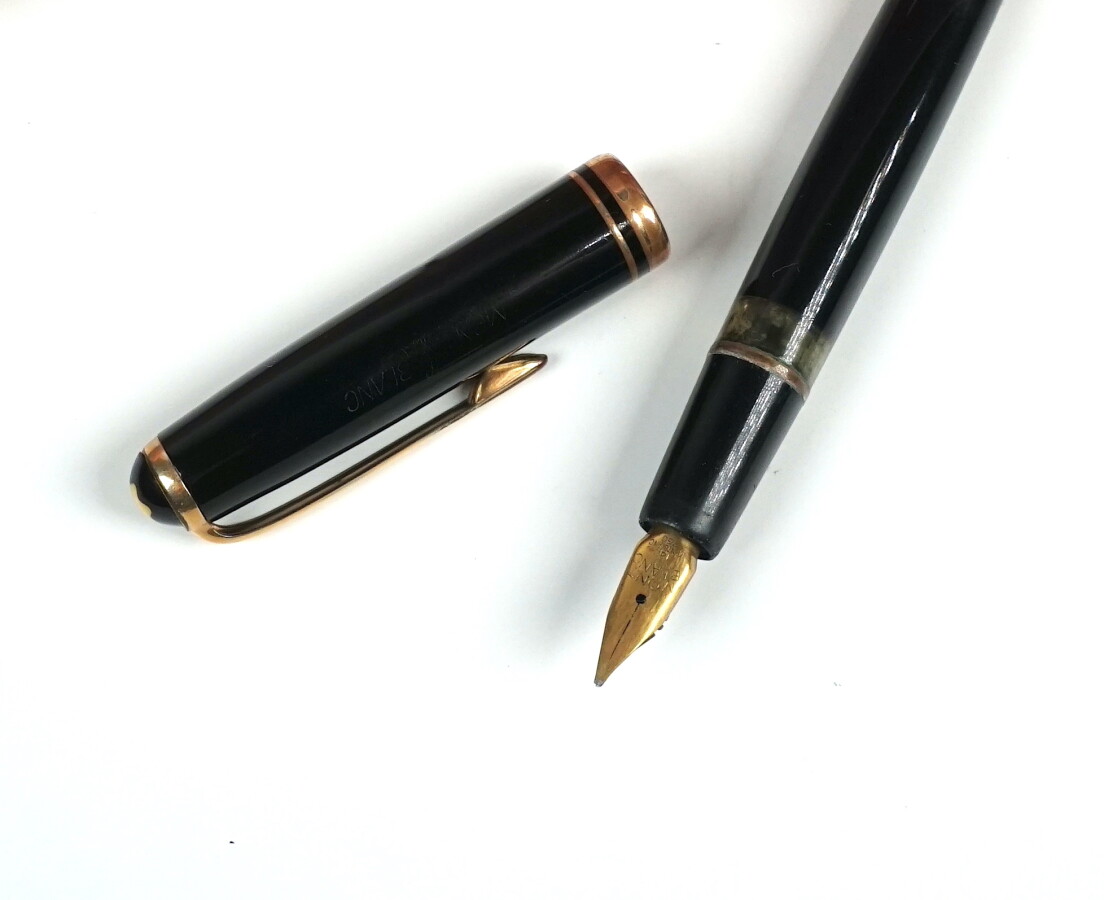 MONTBLANC : Stylo plume en laque noire et métal doré, la plume en or jaune 18K (750/oo), L. 13 cm (quelques traces, un petit enfoncement au niveau du bouchon).