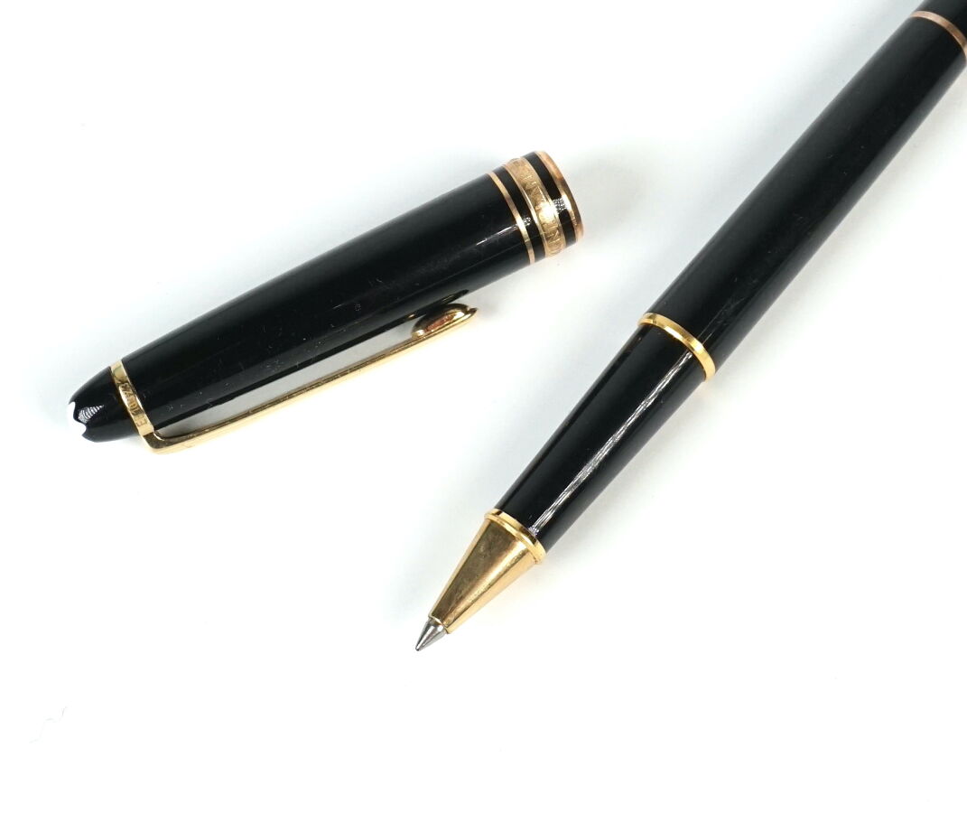 MONTBLANC : Stylo roller "Meisterstück" en résine noire et métal doré, L. 13.5 cm (quelques traces d'usage).