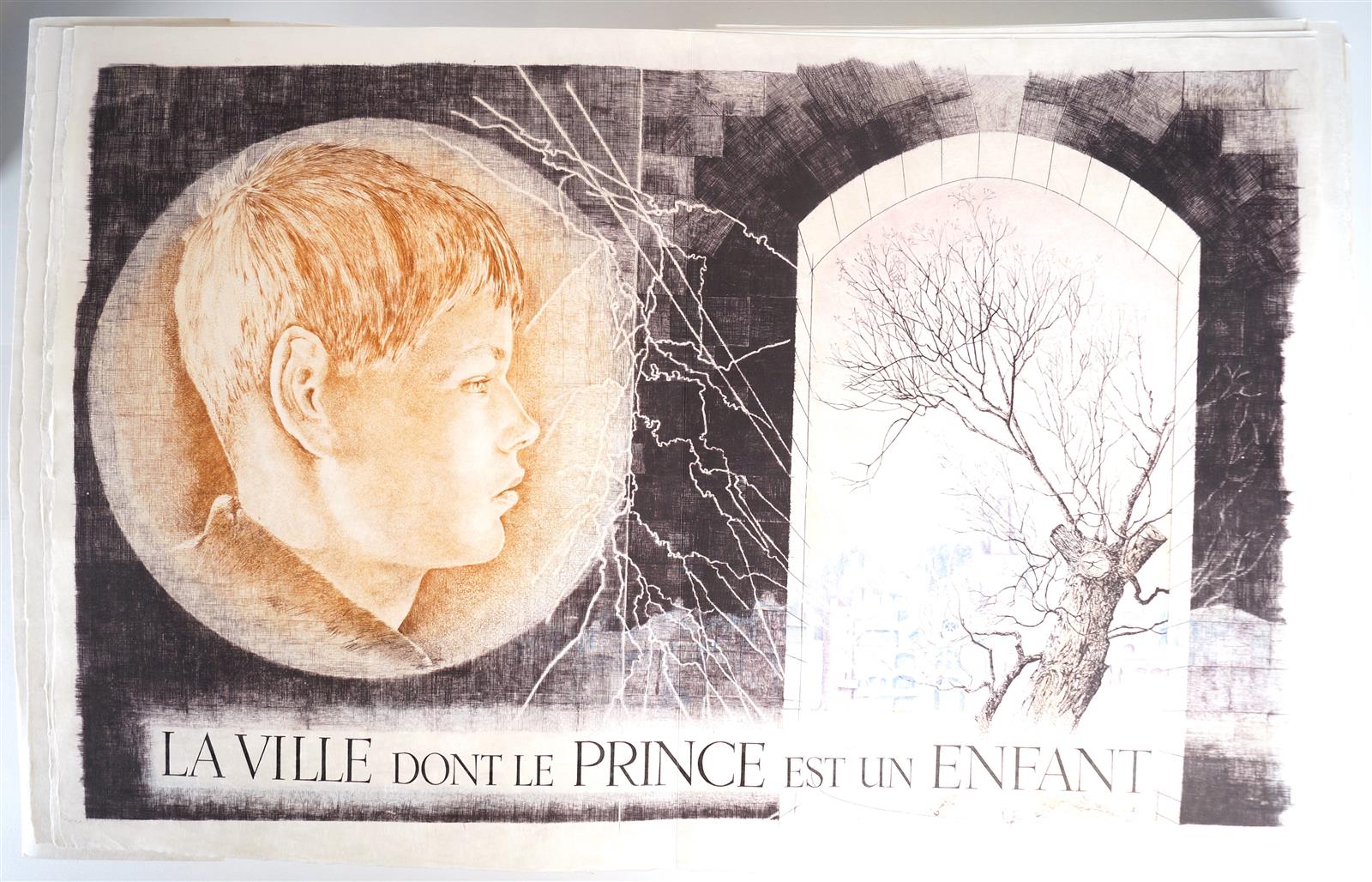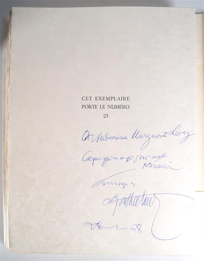 MONTHERLANT (Henry de) - La ville dont le prince est un enfant. Trois actes - Bourg-la-Reine ; Dominique Viglino, [1967] - 1 fort volume In-Folio en feuilles sous chemise rempliée et emboîtage cartonné doublé de toile grise titré au 1er plat et au dos - 21 planches couleurs par Raymond Carrance ayant nécessité 42 cuivres gravés au burin - Ouvrage numéroté sur Japon nacré (n°23 sur les 25, tirage total : 300), enrichi d'1 suite sur Japon nacré, d'1 suite sur vélin d'Arches, d'1 décomposition en couleurs des 42 cuivres sur Rives, de 3 planches simples doublées moire et d'1 long envoi autographe signé d'Henry de Montherlant - Très bel exemplaire.