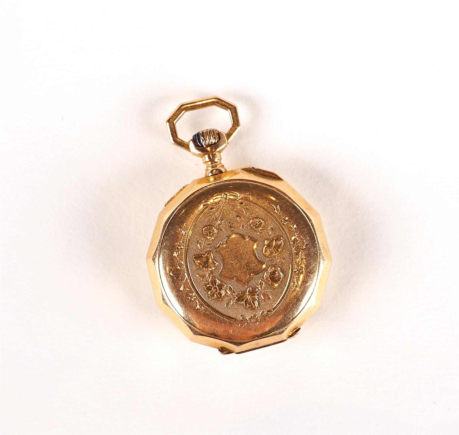 Montre à gousset à pans en or jaune 18 K (750/oo) poinçon tête de cheval, à décor d'un cartouche central et de guirlandes fleuries sur un fond légèrement guilloché, cadran émaillé blanc chiffres romains pour les heures, chiffres arabes pour les minutes, clapet intérieur en or également marqué "Adèle Liard 1883", numérotée 21576, D. 3 cm, H. 4.5 cm. Poids brut : 27.5 g environ.