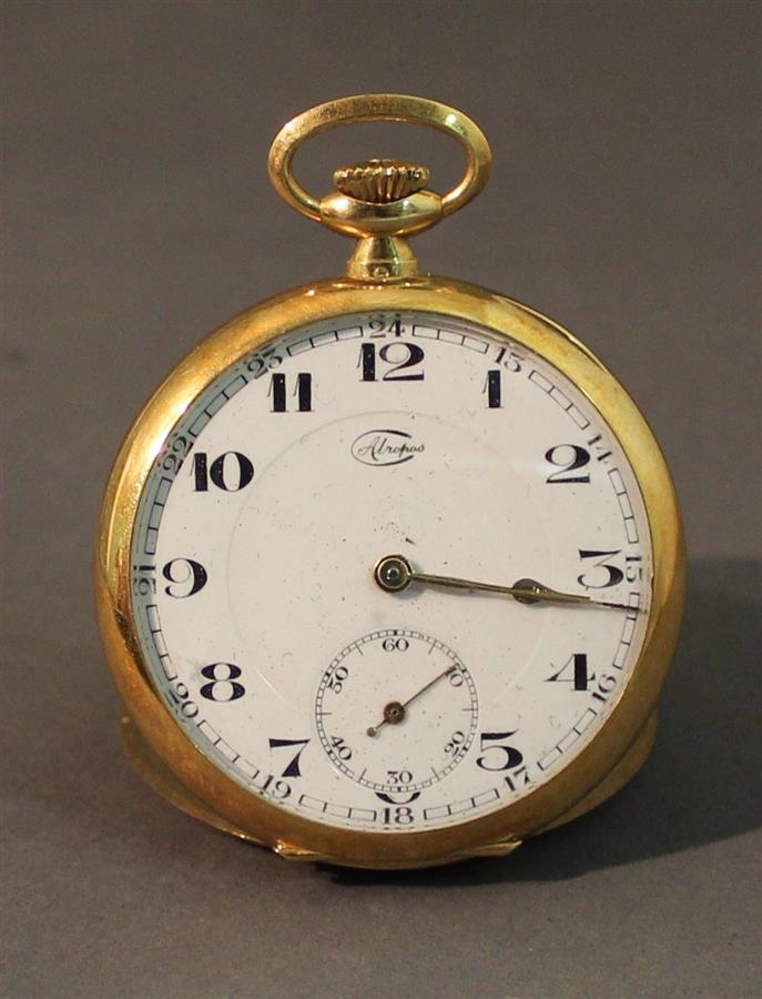 Montre à gousset en or jaune, cadran chiffres arabes. Poids brut : 70 g environ (fonctionne)