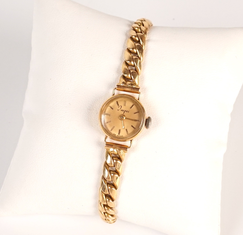 Montre de dame en or jaune 18 K (750/oo), cadran circulaire à index signé "Impec", D. 1.5 cm, numérotée 48745, bracelet souple maille gourmette, L. 16 à 16.5 cm. Poids brut : 12 g environ.