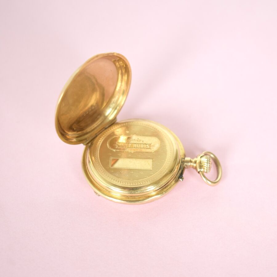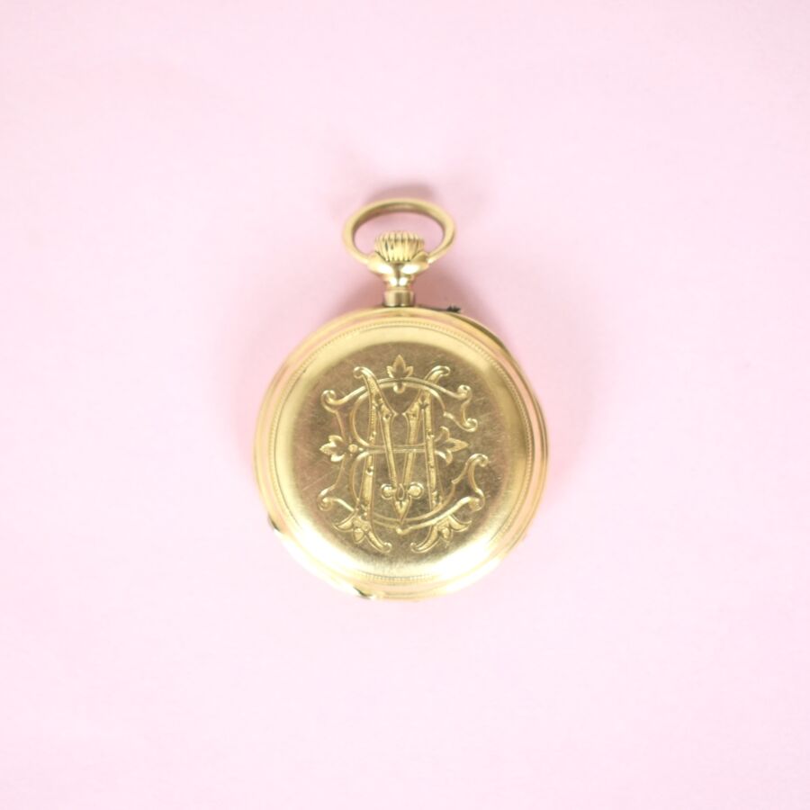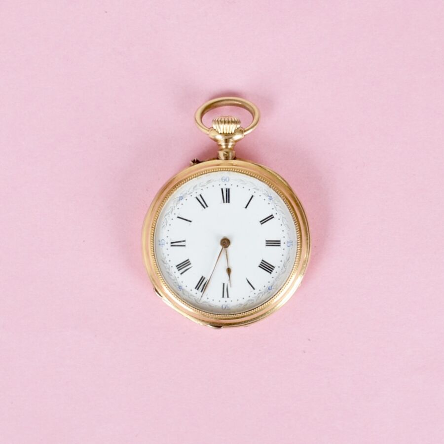 Montre de gousset 18K (750/oo) avec verre, le cadran émaillé blanc à chiffres romains, minuterie chemins de fer ponctuée de petits points dorés avec repères des quarts en chiffres arabes bleus dans un décor de frise végétale, aiguilles dorées, dos du boîtier à décor gravé d'un monogramme « EM », D. 3.3 cm. H. 4. cm. Poids brut : 41.6 g environ. (infimes chocs sur le pourtour)