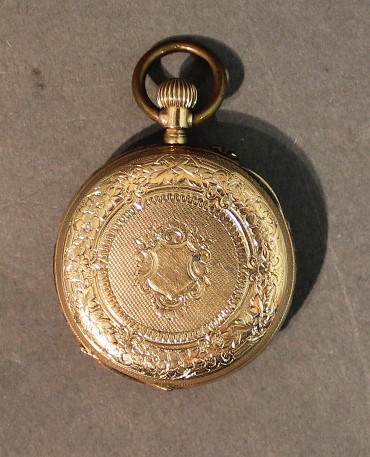 Montre de poche en métal et or jaune 14 K, à décor ciselé, cadran émaillé blanc, chiffres romains, circa 1900. Poids brut : 33 g environ.