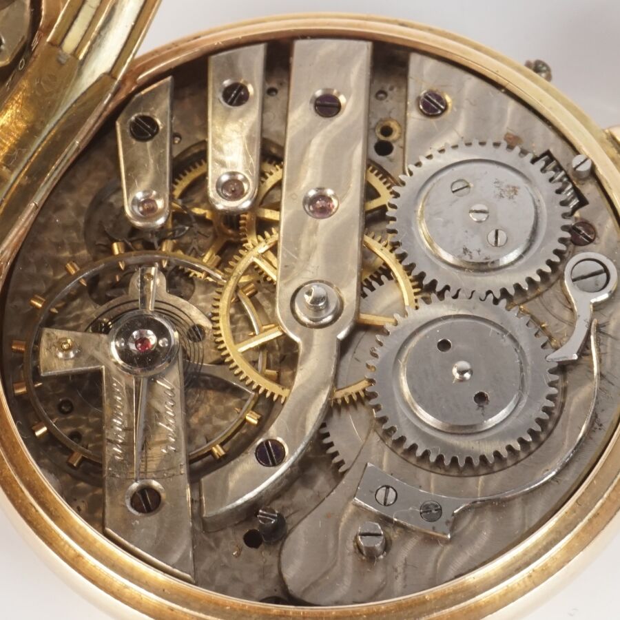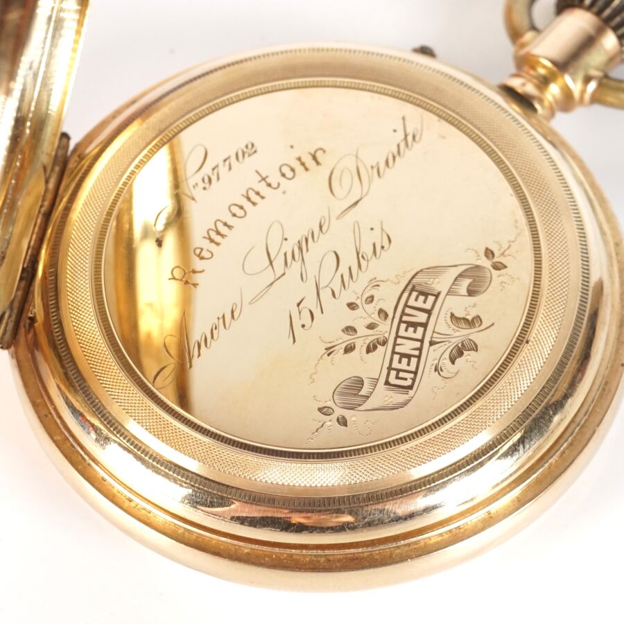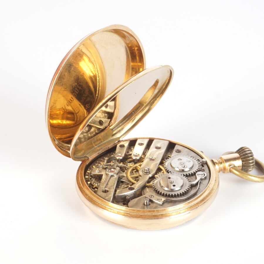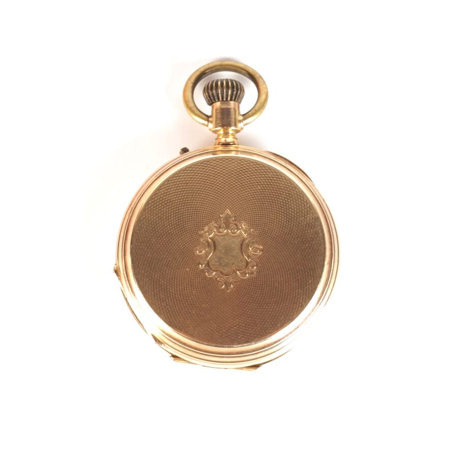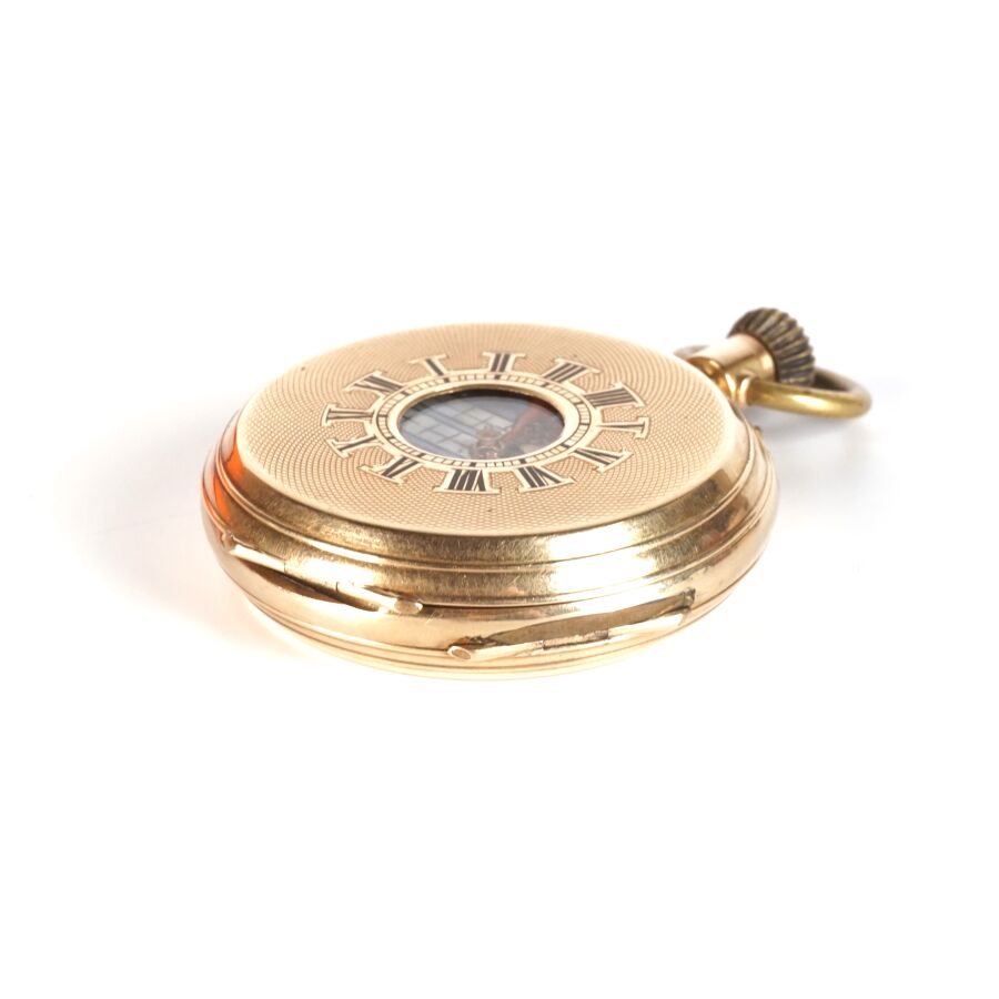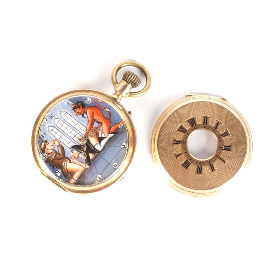 Montre de poche en or jaune 14K (585/oo), boitier supérieur à décor d'un cadran, chiffres romains pour les heures émaillées en noir sur fond guilloché, ouvrant sur un cadran émaillé polychrolme à motif d'une scène dite de "Curiosa", cuvette intérieure en or jaune 14K (585/oo), bélière en métal, H. Hors bélière : 6.1 cm. Diam. 4.7 cm. Poids brut : 70 g environ.