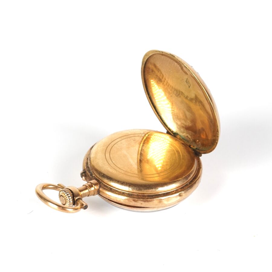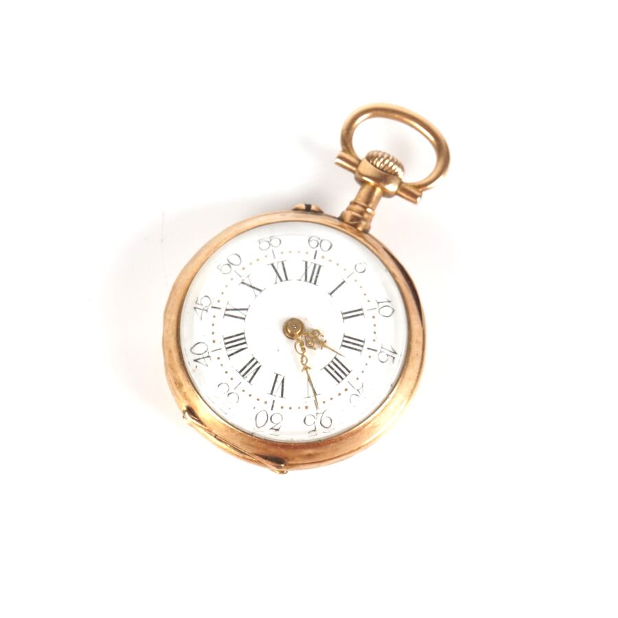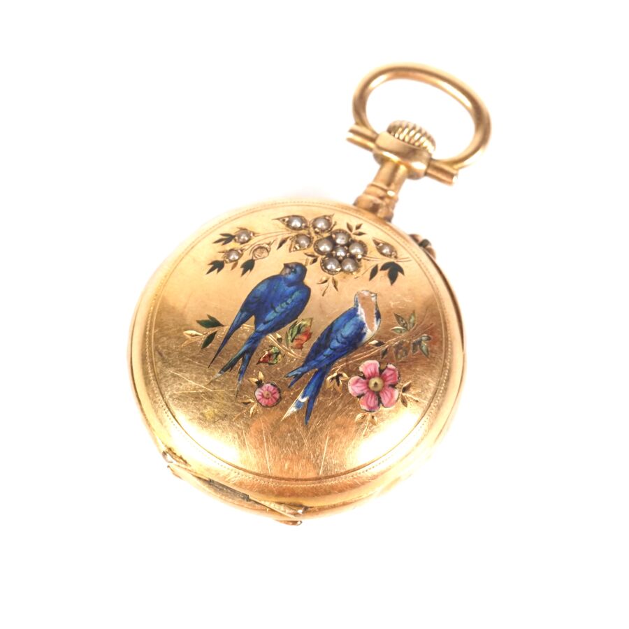 Montre de poche en or jaune 18K (750/oo), poinçon tête de cheval (1838 - 1919), cadran émaillé blanc, chiffres romains pour le heures et arabes pour les minutes, le revers du boitier à décor émaillé polychrome d'un couple d'hirondelles branchées, surmontées d'une fleur sertie de 12 semi de perles (1 manque), cuvette intérieure en or jaune 18K (750/oo), H. Avec bélière : 4.3 cm. Diam. 2.8 cm. Poids brut : 18.9 g environ.