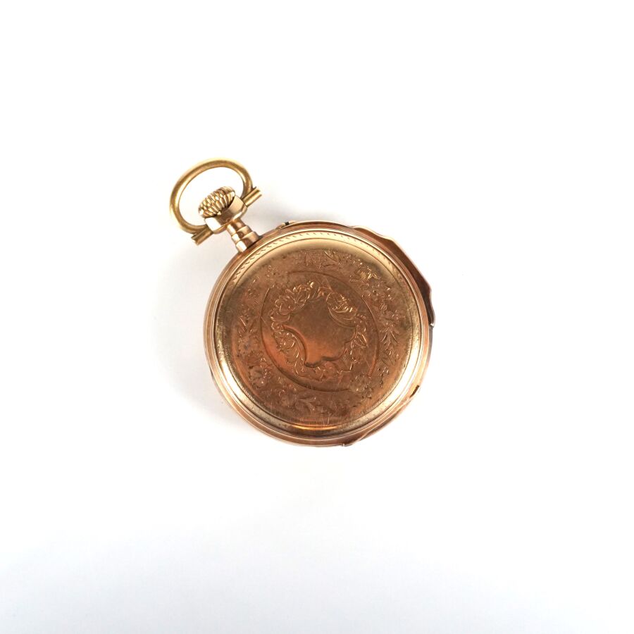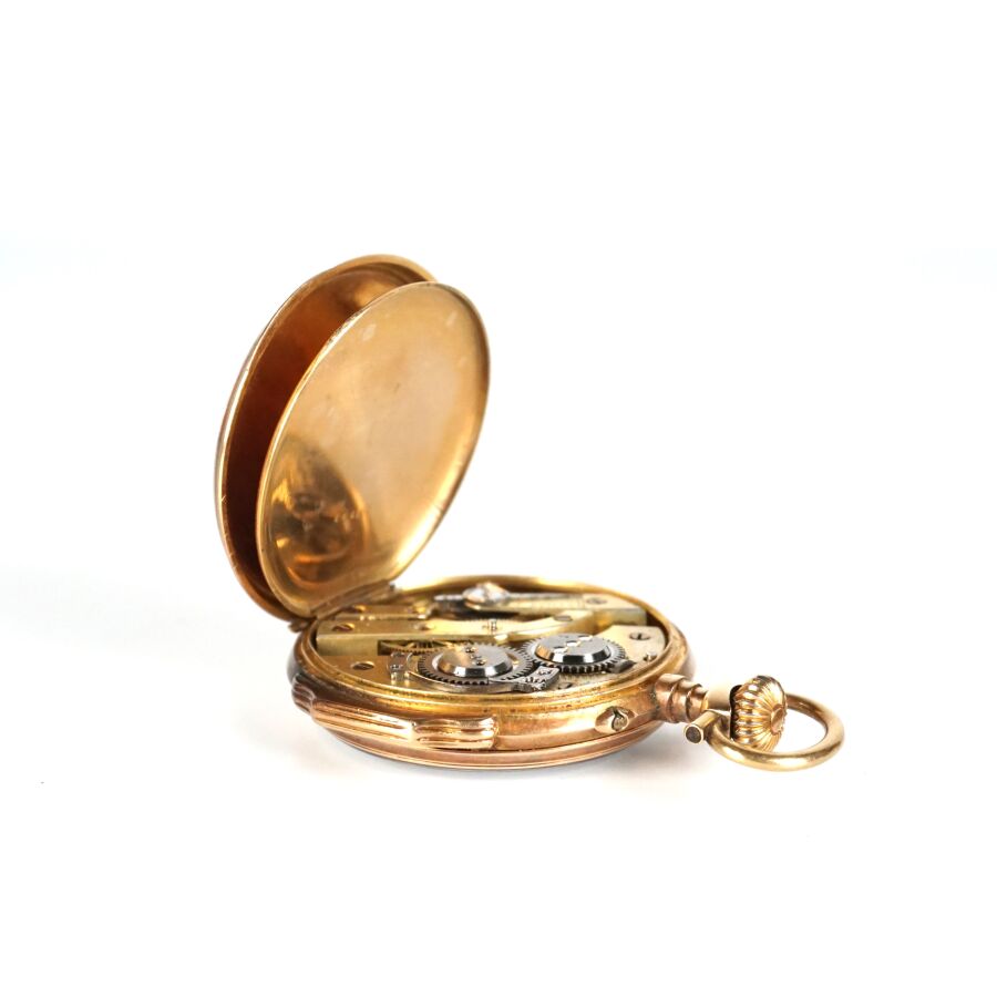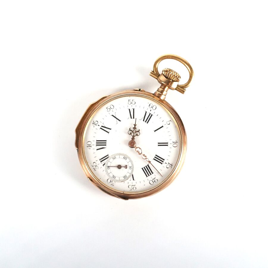 Montre de poche en or jaune 18K (750/oo), poinçon tête de cheval (1938-1919), cadran émaillé blanc, chiffres romains pour les heures et arabes pour les secondes, cadran des secondes à 6H, cuvette intérieure en or jaune 18K (750/oo), Diam. Boîtier : 4.5 cm. H. Totale : 6.4 cm. Poids brut : 62 g environ.