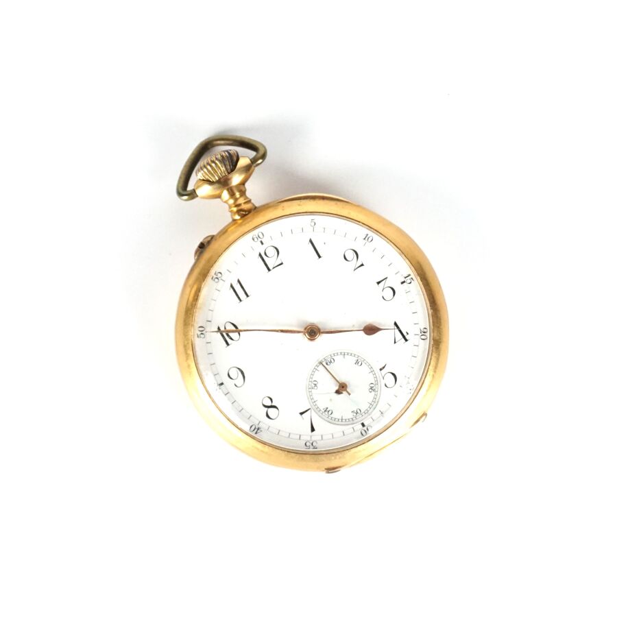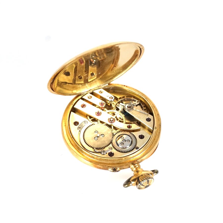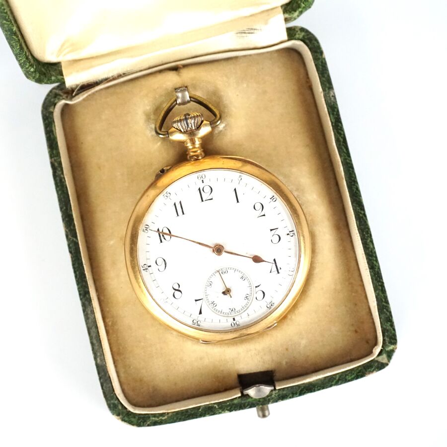 Montre de poche en or jaune 18K (750/oo), poinçon tête de cheval (1838-1919), cadran émaillé blanc, chiffres arabes pour les heures, chemin de fer pour les secondes, cadran des secondes à 6H, revers du boîtier à décor gravé du chiffre "LC", cuvette intérieure en or jaune 18K (750/oo), présentée dans son écrin d'origine, Diam. Boîtier : 4.9 cm. Poids brut : 83.7 g environ (bélière rapportée en métal).