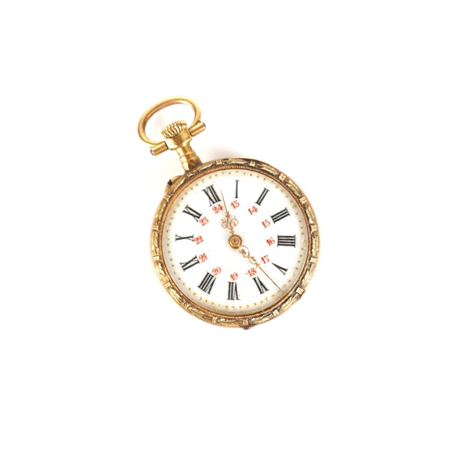 Montre de poche en or jaune 18K (750/oo), poinçon tête de cheval (1838-1919), boîtier rond, cadran émaillé blanc, chiffres romains et arabes dessous pour les heures, encadrement à motif d'une frise de laurier, cuvette intérieure en or jaune 18K (750/oo), Diam. Boîtier : 2.7 cm. H. Totale : 4 cm. Poids brut : 15.7 g environ.