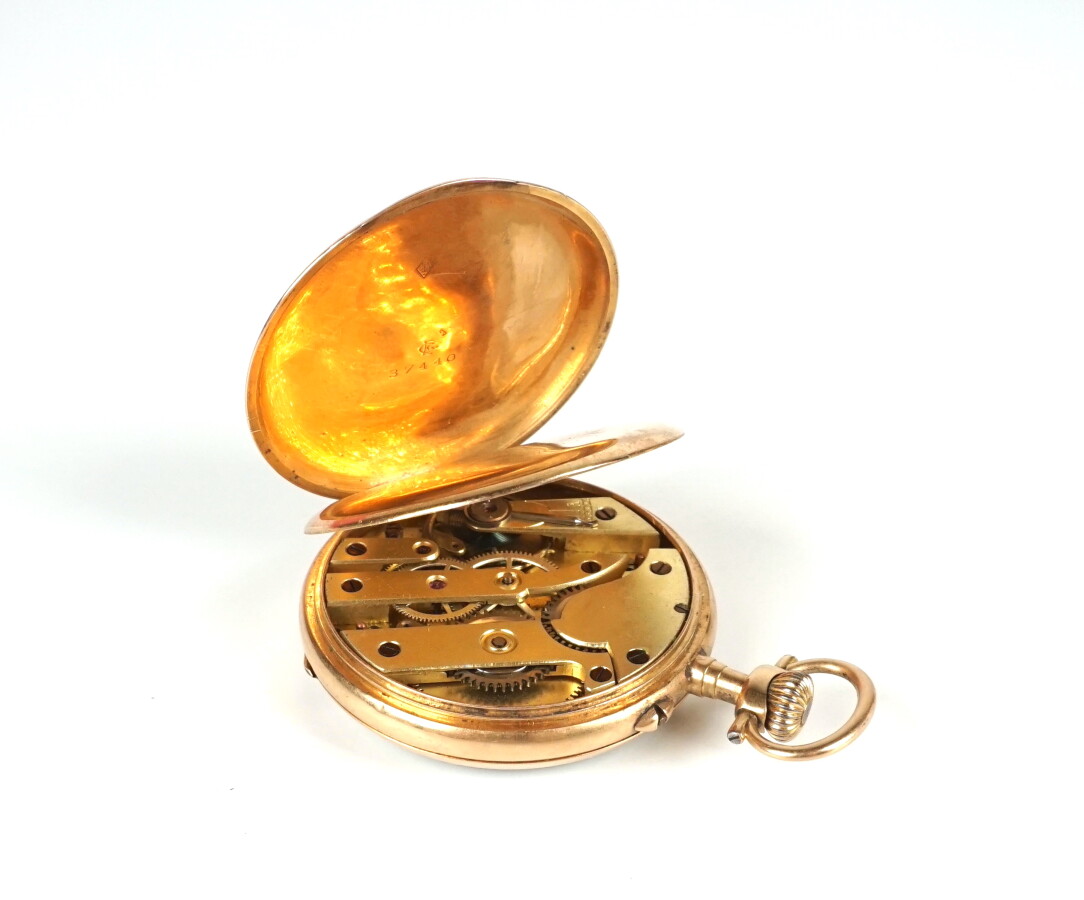 Montre de poche en or jaune 18K (750/oo), poinçon tête de cheval (1838-1919), cadran émaillé blanc chiffre romains et chiffres arabes, compteur des secondes, clapet intérieur or, D. 4.5 cm, H. 6.5 cm. Poids brut : 61 g environ.