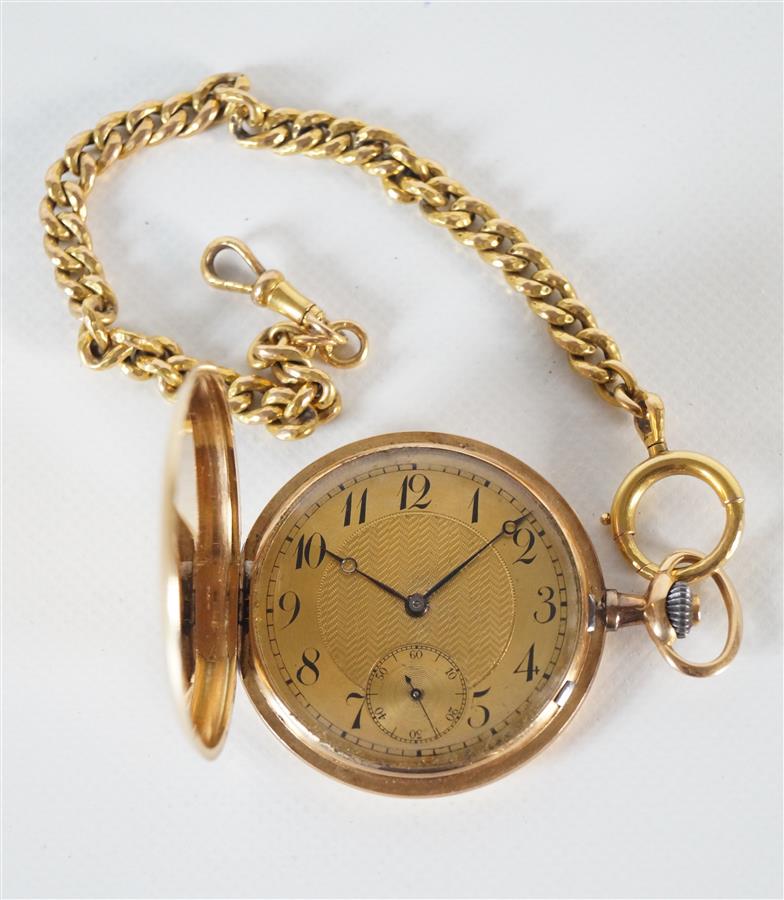 Montre de poche et sa chaine giletière en or jaune 18 K (750/oo), cadran chiffres arabes, cadran des secondes, présentées en coffret. Poids brut de la montre : 60,5 g environ. Poids brut de la chaine : 25,8 g environ.