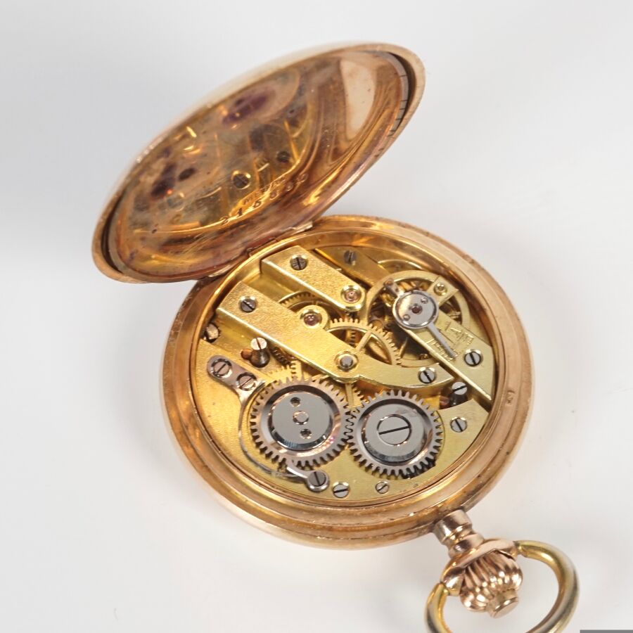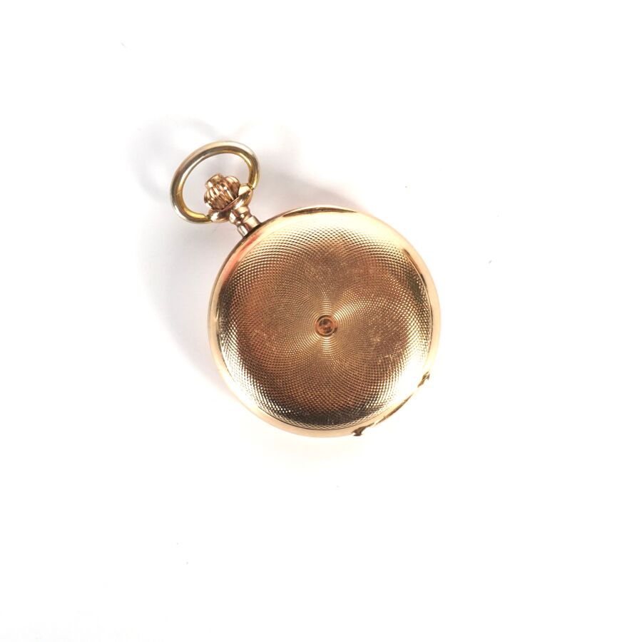 Montre de poche "Savonnette" en or jaune 14K (585/oo) à décor d'un cartouche sur fond guilloché, cadran émaillé blanc chiffres arabes, manque le verre, cuvette intérieure en métal, D. 3 cm, H. 4.2 cm. Poids brut : 22.7 g environ.