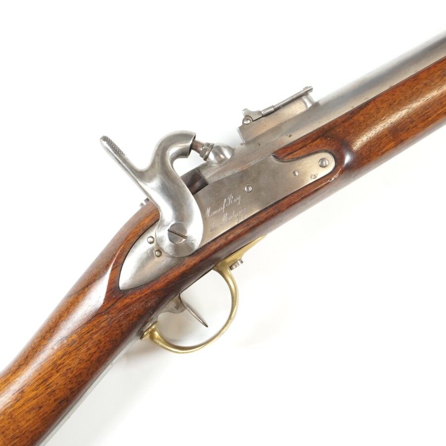 MOUSQUETON D'ARTILLERIE A PERCUSSION MODELE 1829T BIS, platine à percussion à chien et platine à corps ronds de la " Mre Roy de Mutzig ", canon rond de 60 cm à méplats au tonnerre marqué " Cde 17,6 " et " 1579 ", queue de culasse marquée " Mle 1829 T bis ", hausse réglable, garnitures en laiton, monture en noyer au même numéro " 1579 ", baguette en fer, mécanisme semblant fonctionnel, longueur : 98 cm, BE.