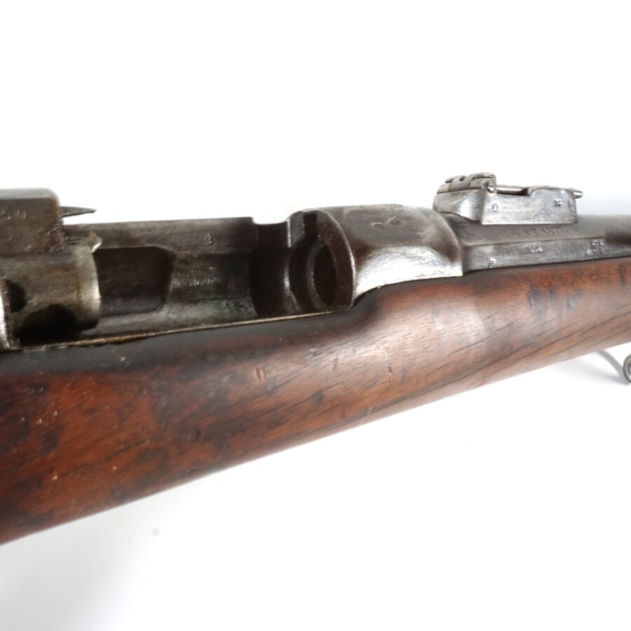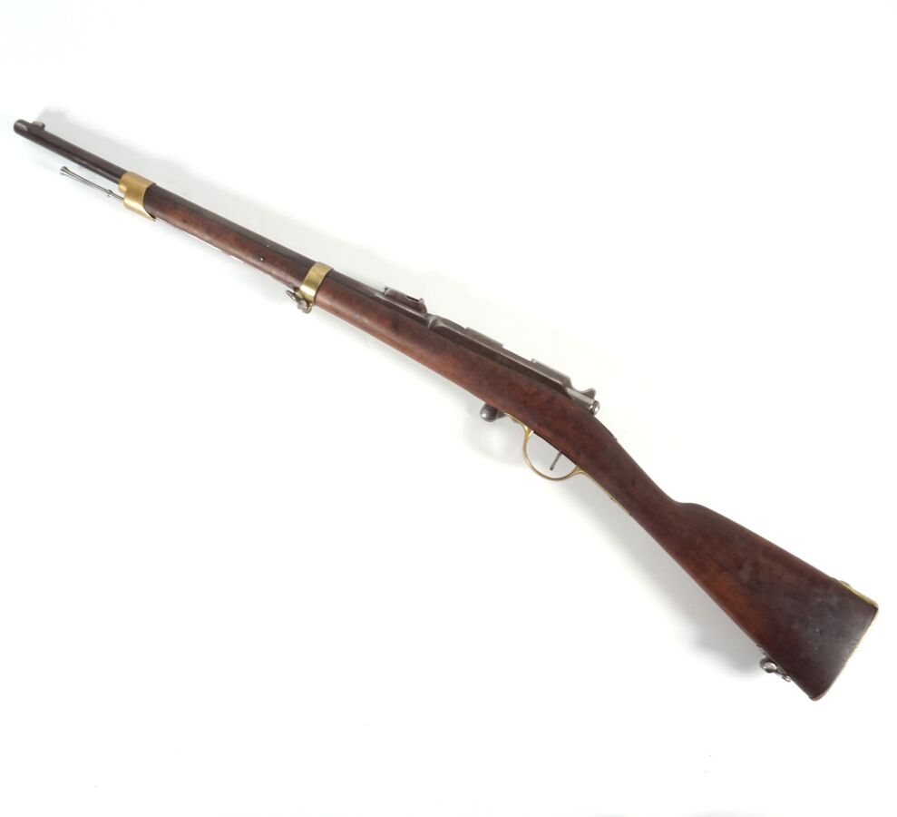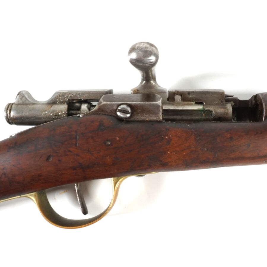 MOUSQUETON D'ARTILLERIE GRAS MODELE 1866-74 M80, boitier de culasse marqué " Manufacture d'Arme Chatellerault 1866-74 M80 ", canon rond de 48 cm à pans au tonnerre marqué " A 253 ", " 1874 ", " T.1877. ", hausse réglable, crosse en noyer (manque), garnitures en fer et laiton, baguette en fer, mécanisme semblant fonctionnel, canon piqué, culasse comportant plusieurs numéros de matricule différent, longueur totale : 98.5 cm, BE.