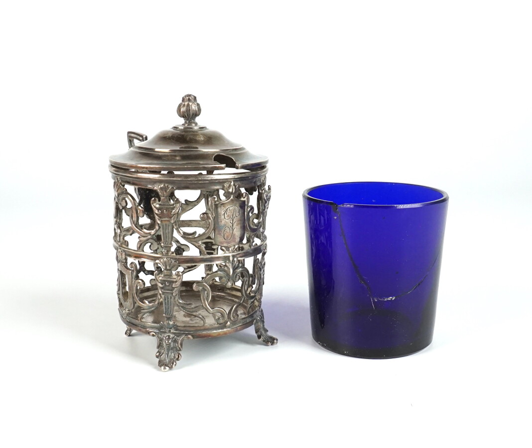 Moutardier en argent, poinçon Minerve, à décor ajouré de consoles cannelées, feuillages et cartouches, parfois monogrammés "R", le fretel formant un fruit, il repose sur 4 pieds feuillagés et accueille une verrine bleue rapportée et accidentée, H. 9 cm. Poids brut monture : 79 g environ.