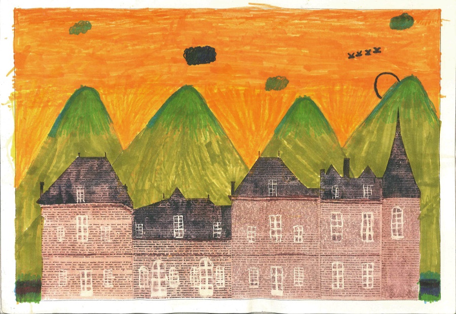 Moyan FENG, "Ciel de la ville", dessin et aquarelle sur papier, 36.8 x 26 cm. * Cocréation avec Malgorzata Paszko.