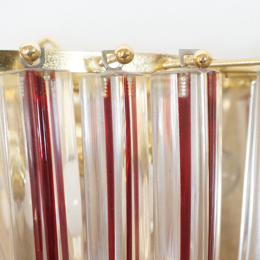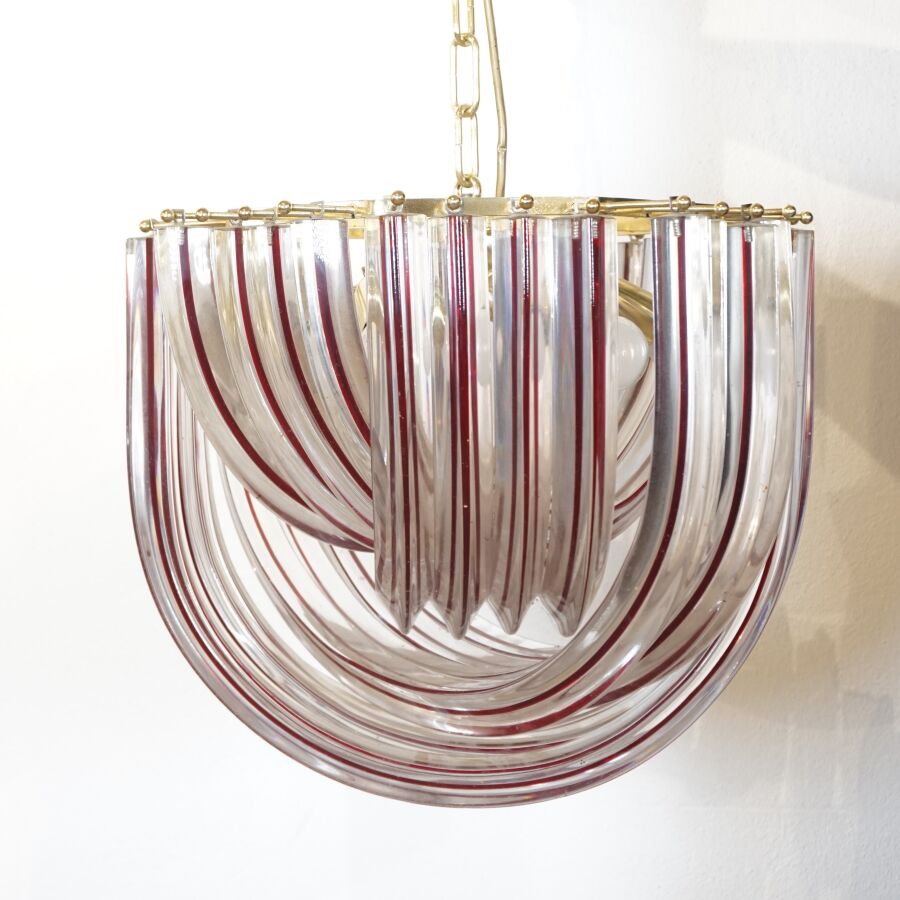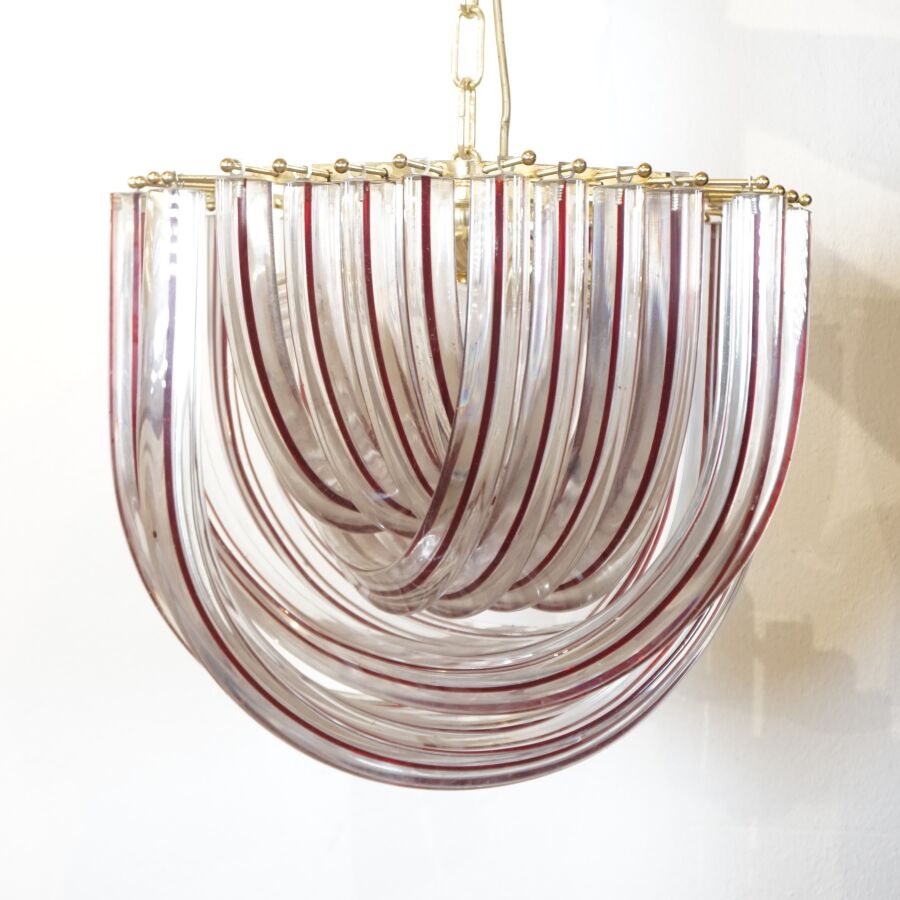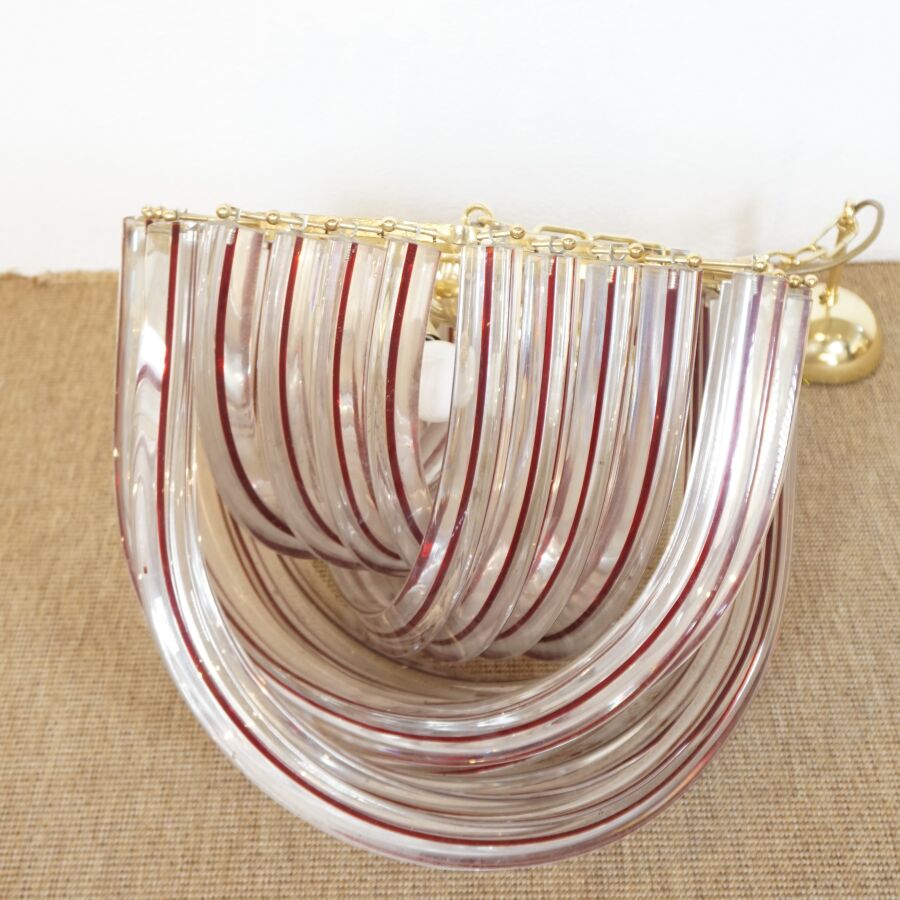 MURANO : Suspension en cristal transparent et partiellement teinté bordeaux, métal doré, circa 1970, H. 35 cm, Diam. 40 cm.