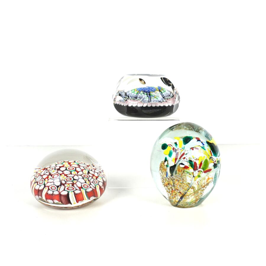 MURANO : Trois presse-papiers sulfure en verre coloré à décor millefiori, D. De 4.5 à 8.5 cm.
