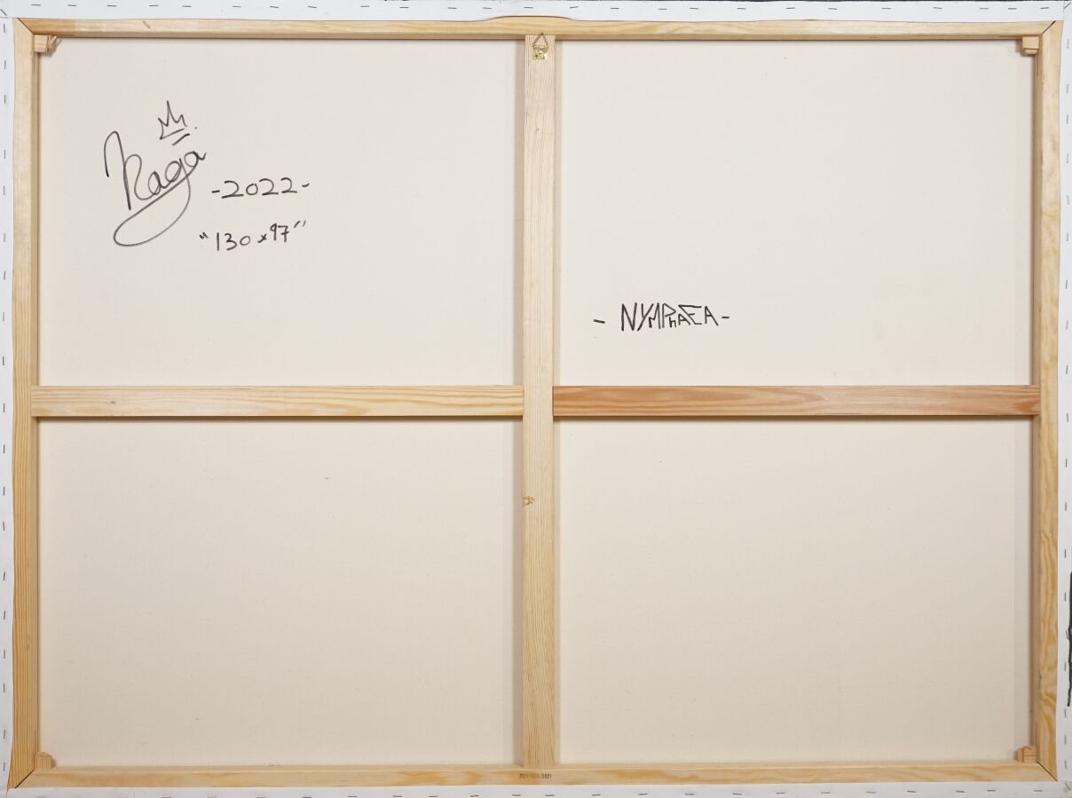 NAGA (XXe), "Nympheae" 2022, acrylique sur toile signée en bas, contresignée et titrée au dos, 130 x 97 cm.