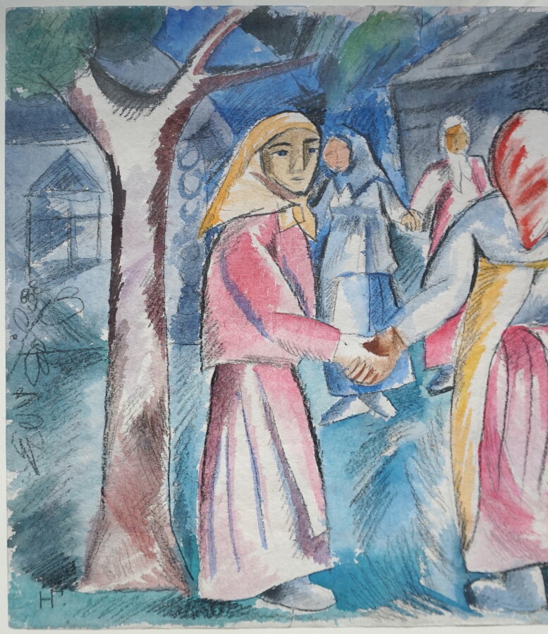 Natalia Sergueïevna GONTCHAROVA (1881-1962), "La ronde" circa 1910, dessin au fusain et l'aquarelle sur papier, monogrammé en bas à gauche en cyrillique, 39 x 57 cm (petites déchirures sur le pourtour, deux petits trous dans le papier et léger soulèvement du papier "anomalie" du papier (?)).