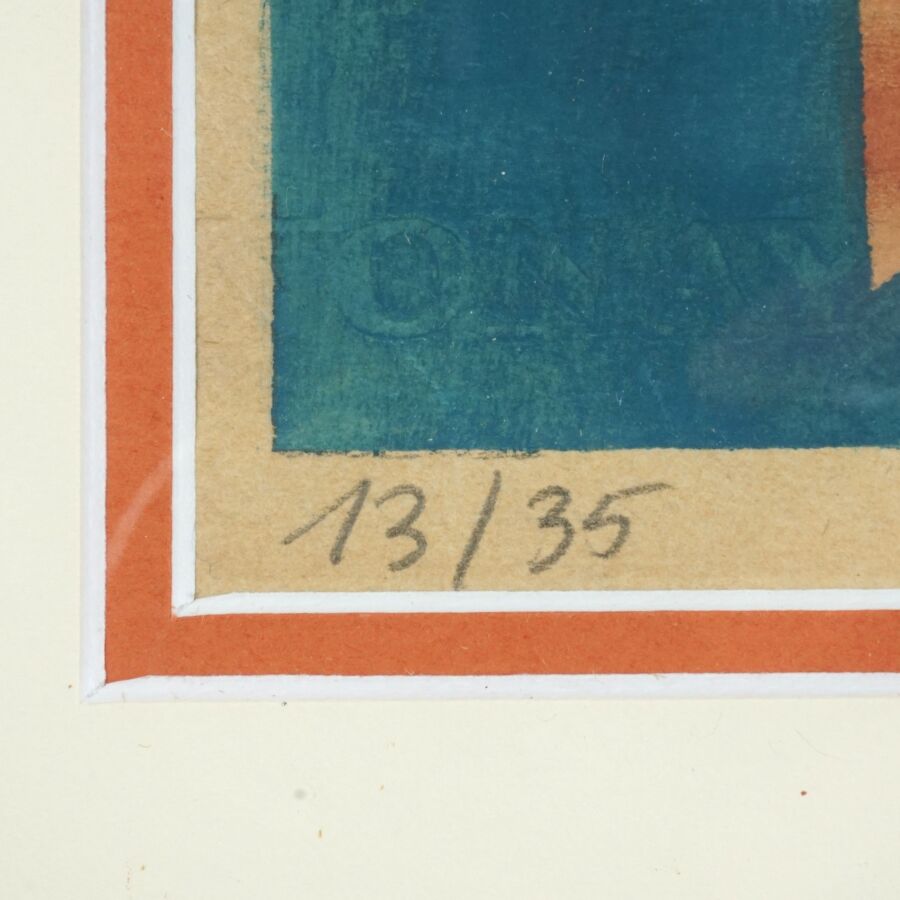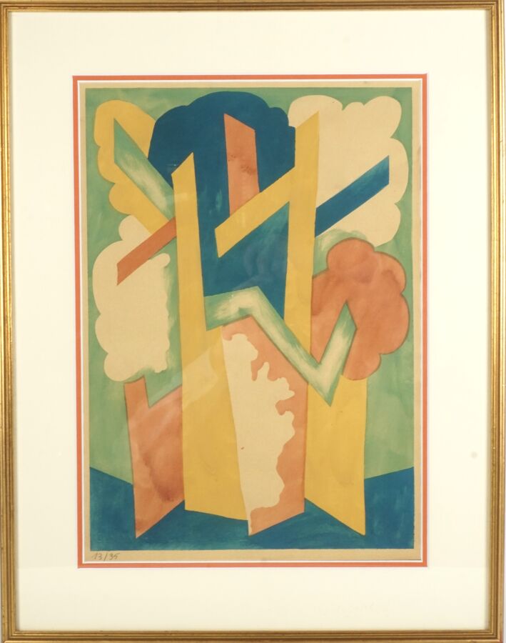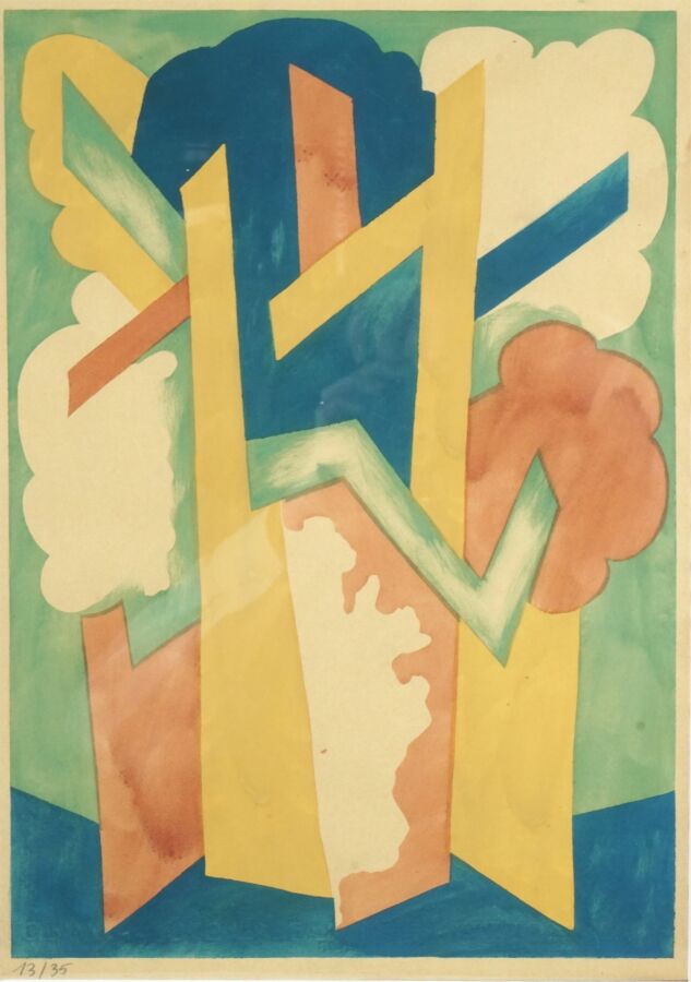 Nathalie GONTCHAROVA (1881-1962), "Composition rayonniste", pochoir sur papier, justifié au crayon en bas à gauche 13/35, non signée, Dim. 37,5 x 27 cm (à vue).