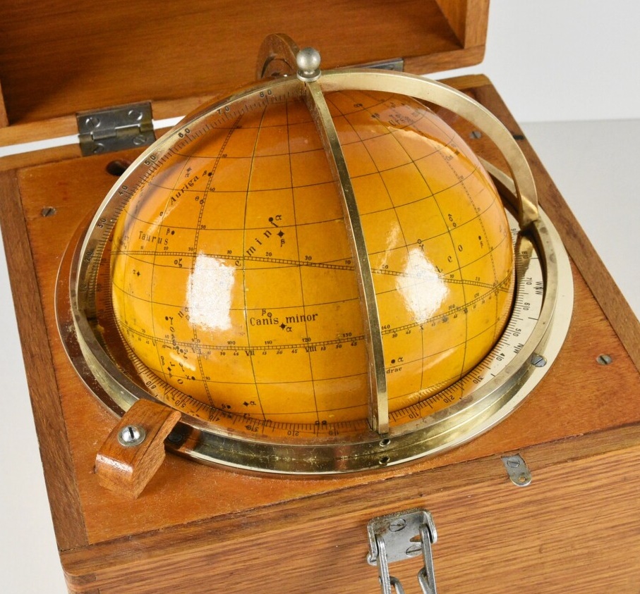 Navisphère dite "Tête de veau", dans son coffret de protection en chêne, globe libre en rotation libre fixé au niveau de son axe polaire, fixé aux cercles méridiens en laiton ciselé, modèle russe, l'intérieur du couvercle découvrant deux notices plastifiées en cyrillique, D. de la sphère : 18 cm. Dimensions de la boîte : 26 x 24 cm (petites usures à la boîte et à la sphère).