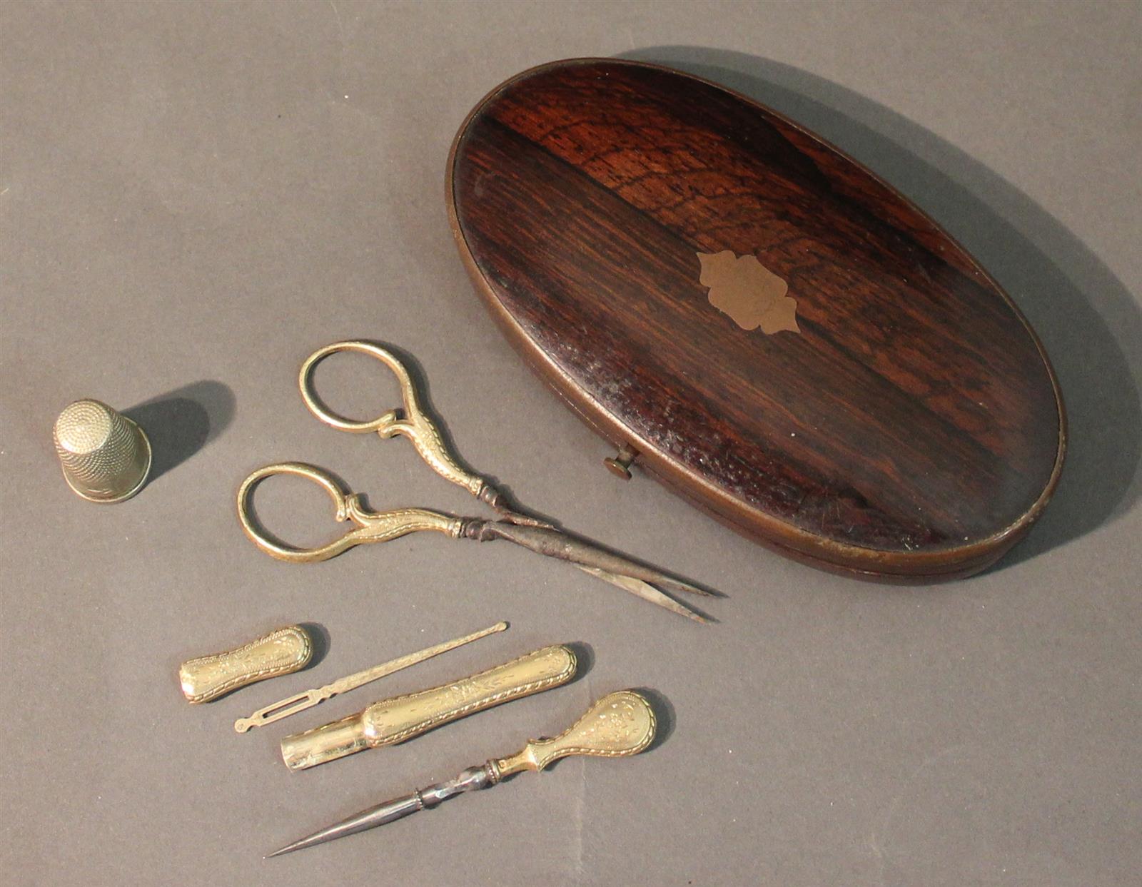 Nécessaire à coudre de forme ovale en palissandre, les accessoires en or et argent, époque Napoléon III, 7 x 12.5 cm.