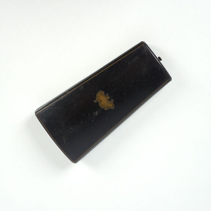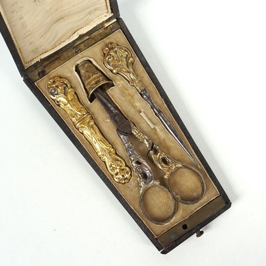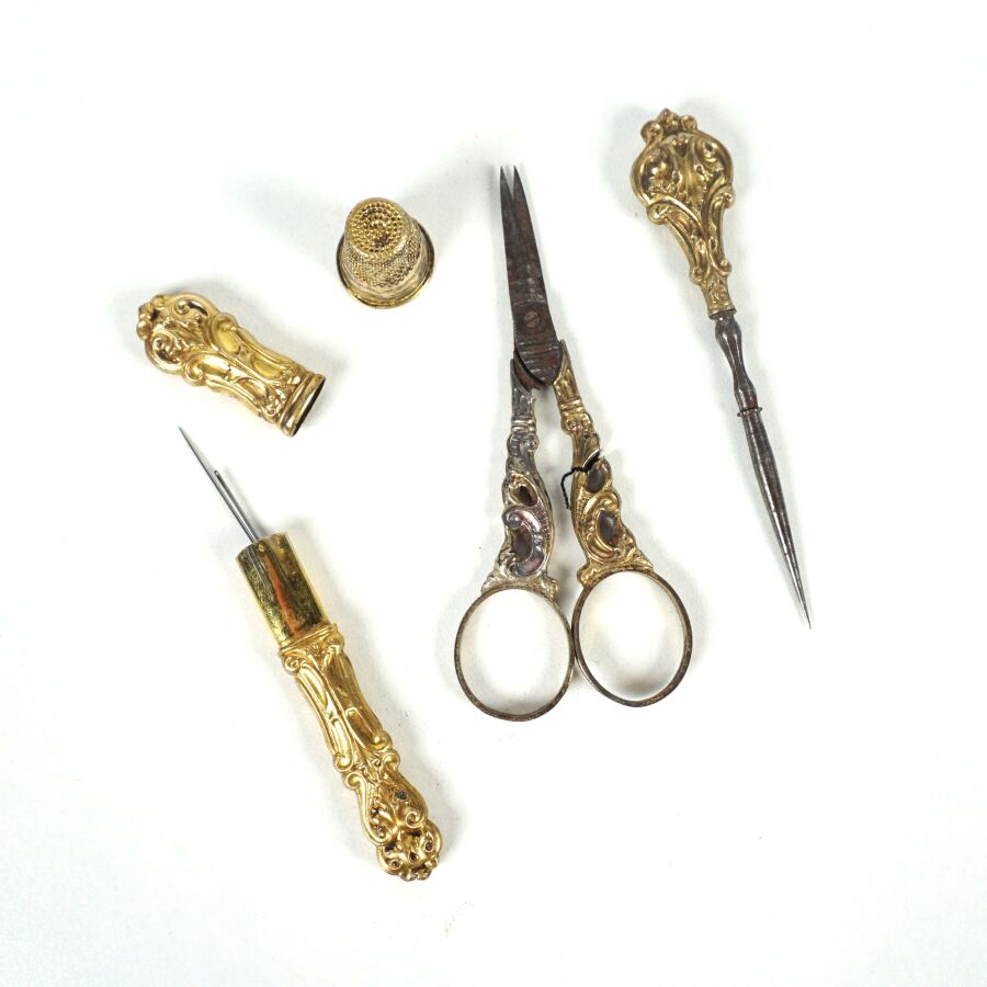Nécessaire de couture en vermeil (800/oo) et métal, poinçon sanglier, comprenant un porte-aiguilles, un dé à coudre, une pointe et une paire ciseau (accidentée), présenté en coffret d'origine, 19ème siècle (usures).