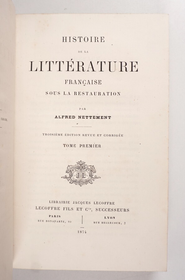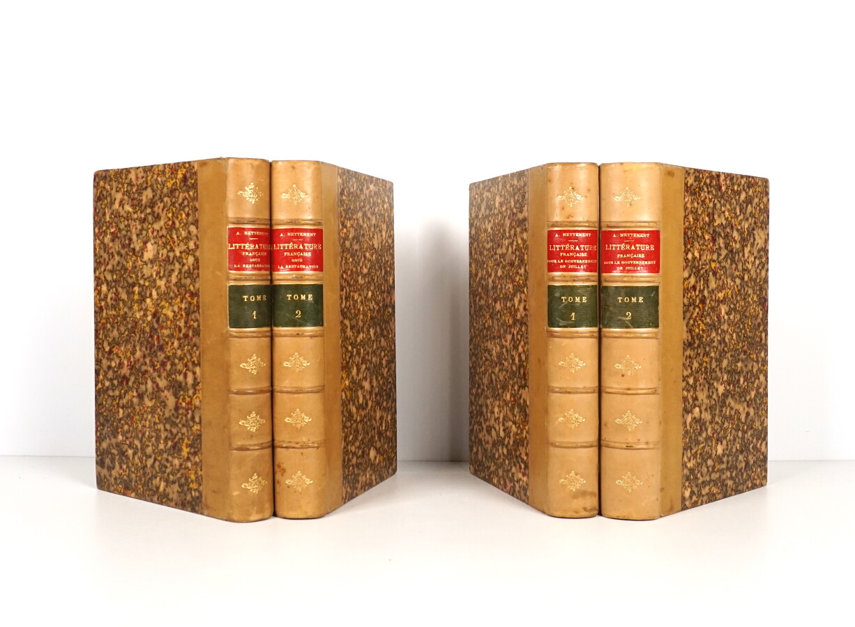 NETTEMENT (Alfred) - Histoire de la littérature française sous le gouvernement de juillet - Paris, Lyon ; Librairie Jacques Lecoffre et Cie, 1874, 2nde édition - 2 volumes In-8° - Reliure de l'époque demi-basane fauve - Dos à nerfs ornés - Pièces de titre et de tomaison maroquin cerise et havane - Bon exemplaire - On y joint : Le même ouvrage en 3ème édition enrichie de 1876, reliure identique.