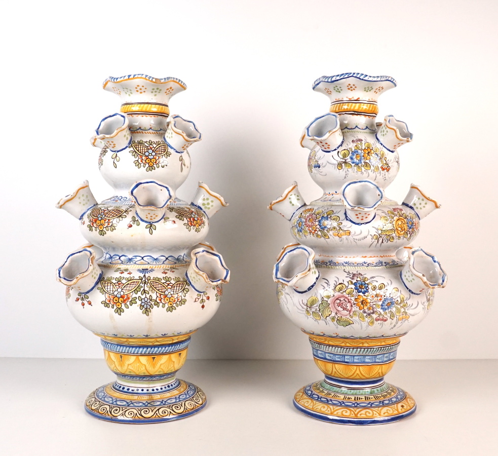 NEVERS - MONTAGNON : Ensemble de deux tulipières en faïence émaillée polychrome, l'une à décor de bouquets de fleurs et l'autre ornée de guirlandes fleuries, H. 36 cm (petits éclats et retrais d'émail, un col cassé recollé).