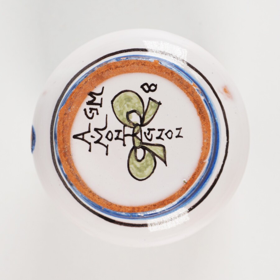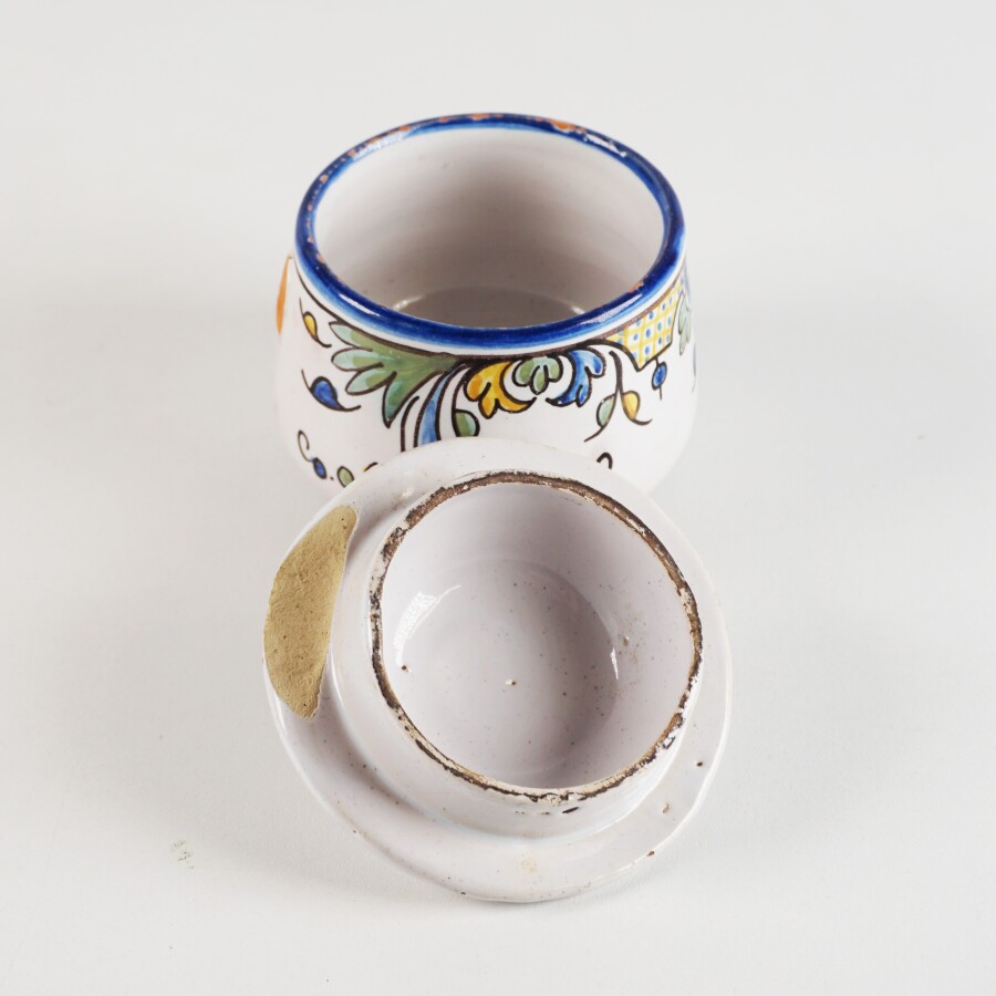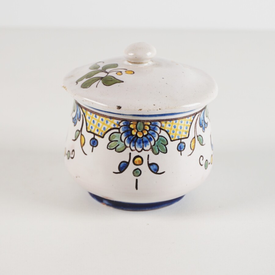 NEVERS MONTAGNON : Tasse couverte en faïence polychrome émaillée à décor de feuillages et d'une fleur, marqué au-dessous, H. 8.5 cm (accident à l'anse, éclat du couvercle).