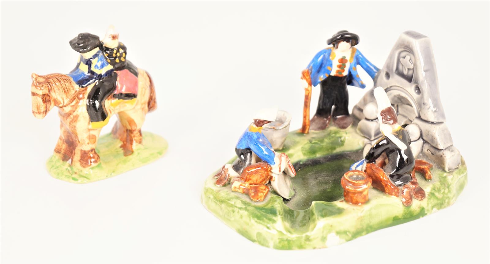 NIK : Lavandière à la fontaine, L. 12 cm. On y joint un couple de quimperois à cheval marqué JT, H. 7 cm.