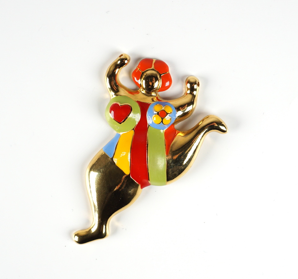 Niki DE SAINT-PHALLE (1930-2002) : Pendentif "Nana" en métal doré et émail multicolore, édition Flammarion 1999, signé et daté au dos, H. 8 cm (présenté sans cordon).