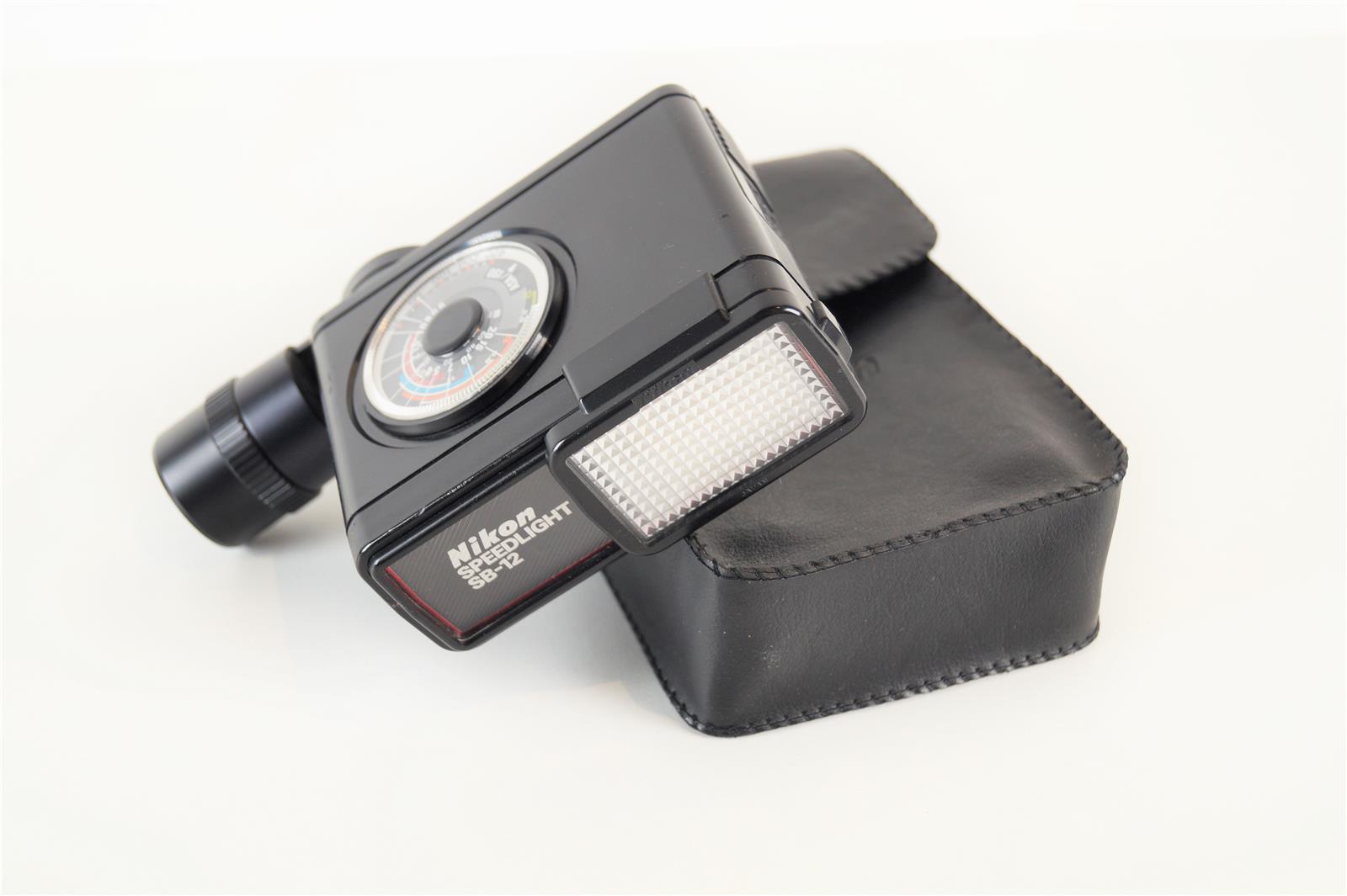 NIKON F2 AS, boitier n° 7789244, avec un flash Speedlight SB-12 présenté dans sa pochette.