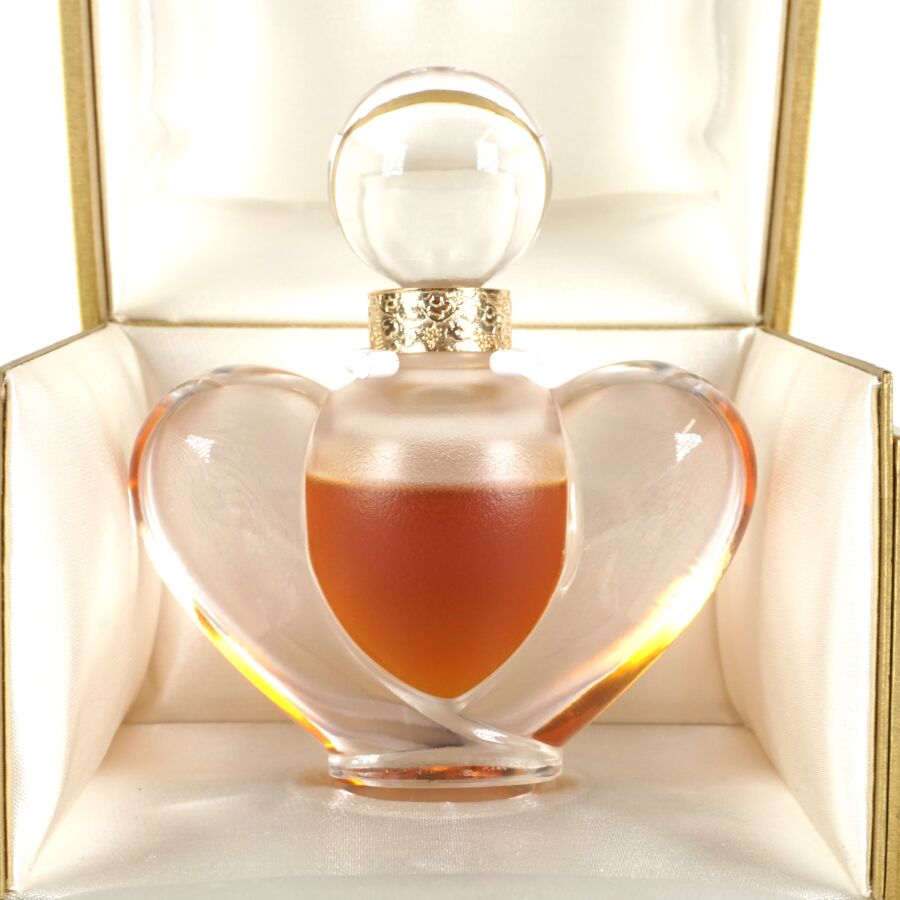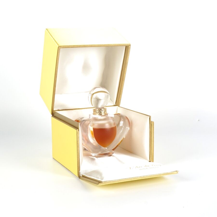 NINA RICCI - LALIQUE : "Farouche" (1974), flacon en cristal à deux ailettes, le col orné d'une bague en métal doré à décor ciselé de fruits et fleurs, signé Lalique sur la base, bouchon scellé, PDO, d'après les dessins de Marie-Claude LALIQUE, présenté dans un luxueux coffret "L'air du temps", intérieur satiné blanc, H. 9 cm.